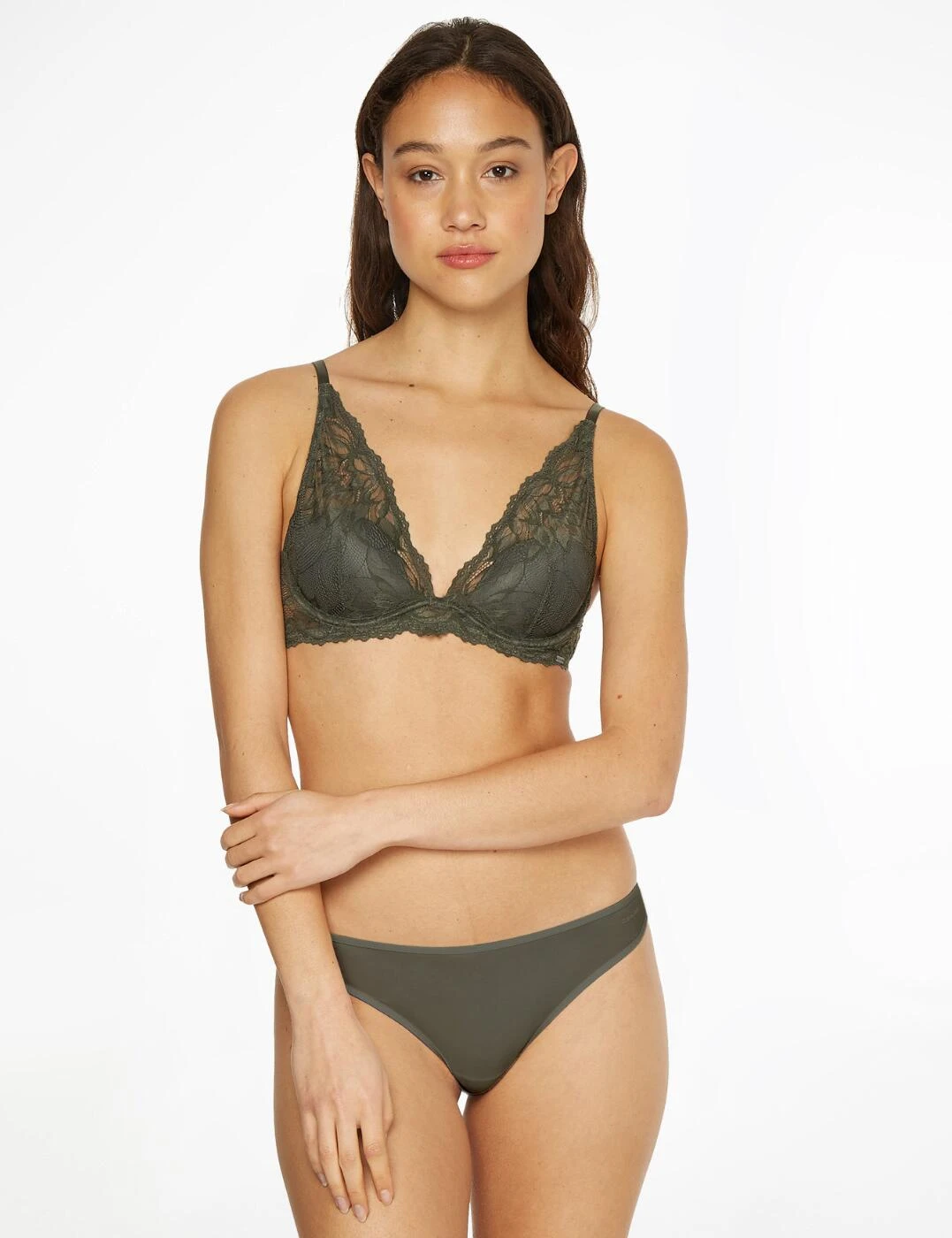 The Seductive Comfort Lotus Floral collection from the iconic lingerie brand Calvin Klein blends comfortable everyday designs with luxurious lace fabrics. This lined plunge bra has a feminine floral all-over lace that seductively shows a hint of skin and soft moulded cups for modest coverage. The timeless low plunge neckline adds to the sexy style and the delicate scalloped edges add a feminine finish. Adjustable straps allow for an individual fit and underwiring offers added support. Matching lingerie is available from the Seductive Comfort Lotus Floral collection by Calvin Klein.