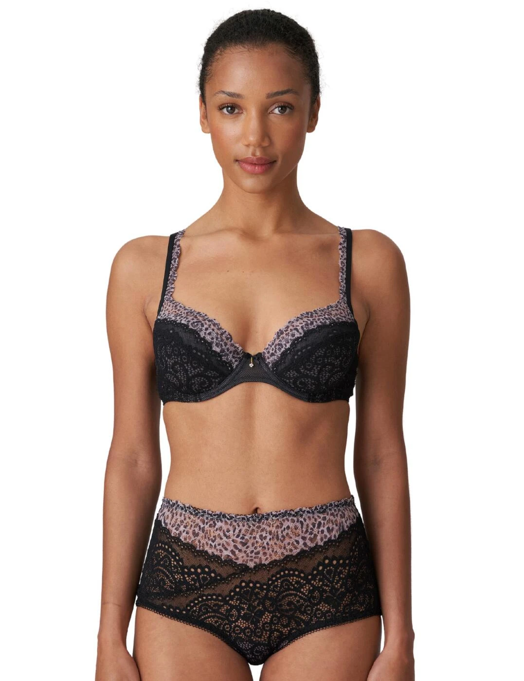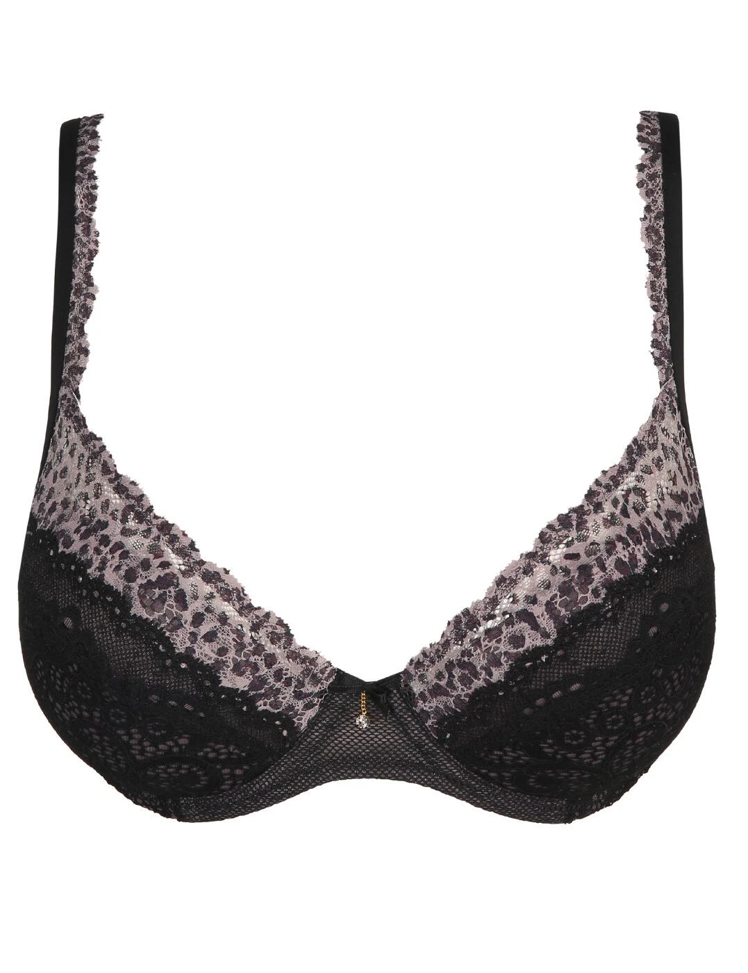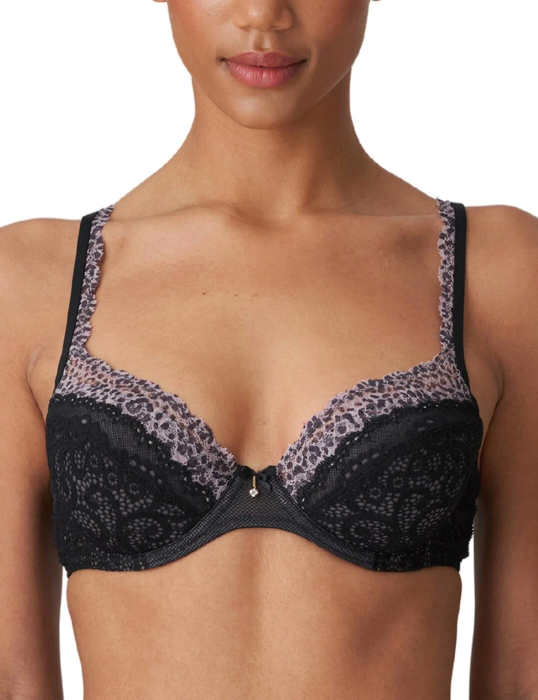The ultra-feminine Coley collection by Marie Jo will boost your mood and your confidence. Flaunt your assets with this push-up bra the plunging neckline highlights your curves which are boosted by the padded cups. Romantic lace adorns the cups finished with a sultry two-tone lace trim that extends onto the shoulder straps. A satin bow embellishes the bridge of the bra and holds a small charm. The bridge and wings are crafted from comfortable and breathable mesh, that will smooth your skin. For a coordinated look pair with matching lingerie.