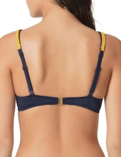 This bikini top from Marie Jo’s Claudia collection is sure to become a favourite. The padded cups and deep plunge neckline are sure to give you a naturally rounded shape whilst offering an abundance of support. Wear the straps over the shoulder or cross them to give the around-the-neck look. Ribbons on the shoulder straps are sure to give off a playful vibe. Adjustable straps and clasp closure are sure to provide you the right tightness. Pair this bikini top with a matching coordinate to complete your summery look.