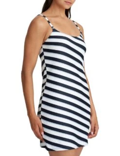 Enjoy a fashionable day at the beach with Marie Jo Sitges’s short swimwear dress! This stylish pull-on swim dress is perfect for any summer activities. Crafted from lightweight, comfortable material, the dress sits mid-thigh and features playful diagonal stripes that create an eye-catching look. The adjustable straps and pull-on style make it easy to customize the dress to fit your body without being too snug or too loose. Plus, take advantage of having matching swimwear also available.