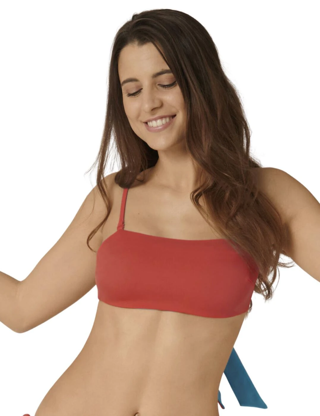 Refresh your swimwear collection with the Shore Kosrae range by Sloggi. This bandeau bikini top is super versatile with the reversible option of 2 different colours and a range of different styles such as strapless, cross back and a classic back. The bikini top is made from a plain opaque print with a tie back that can be tied in a bow for a cute look. It has adjustable straps and the tie back can be altered to create your perfect fit. This swimwear will also last you well with chlorine resistant materials that are also quick drying with UPF 50 protection, the perfect holiday/summer piece.