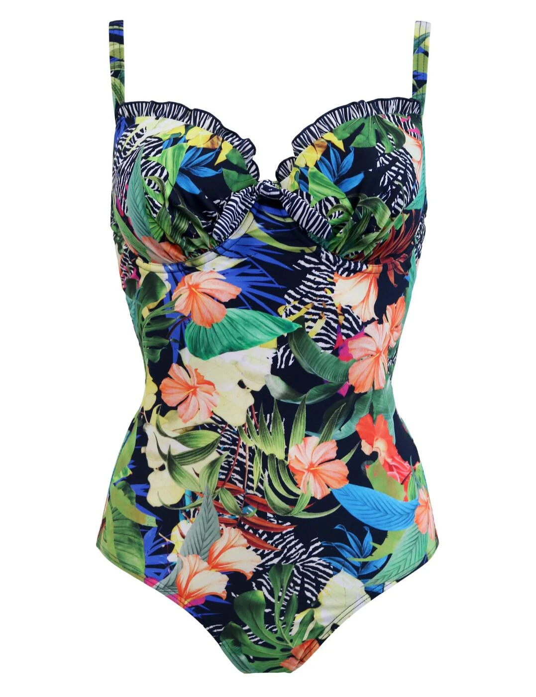 If your looking for swimwear with more coverage this Havana Breeze padded underwired swimsuit by Pour Moi is perfect for you. It features full coverage cups with a beautiful tropical print and a zebra frill detailing around the cups. The rounded shaped cups are padded and underwired which helps create a gorgeous shape and additional support. It fastens at the back with a clasp with a feminine cut out detail below. The straps are adjustable allowing for a unique fit and the rear provides medium rear coverage. It is finished off with a zebra print cute centre bow.