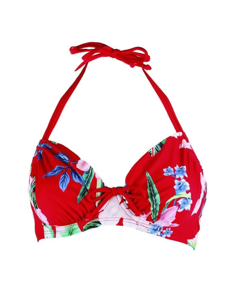Pour Moi’s new Miami Brights range features a botanical floral print in a contrast colourway. This bikini tops secures around the neck with a halterneck tie and offers good coverage, with a balcony cut that is both flattering and functional. You can also untie the straps whilst sunbathing to prevent tan lines. This piece is adorned with a dainty bow and fastens at the back using a plastic snapback closure. Matching sets available for a completed look.