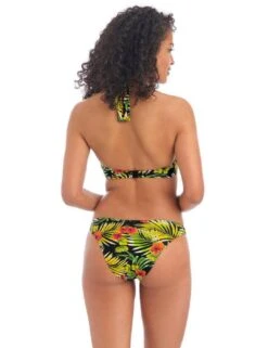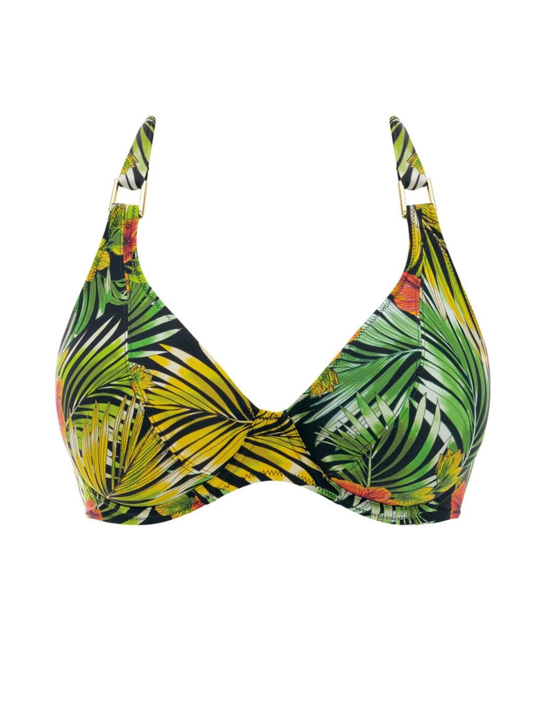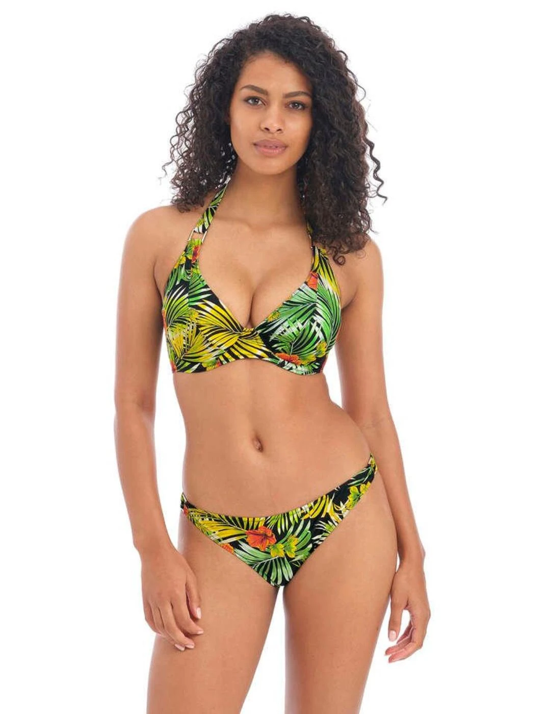 Create a standout look with the Maui Daze range by Freya which introduces this halterneck bikini top. It brings swimwear in a bright tropical print with gold hardware square charms on the straps. This bikini top is incredibly flattering with a deep plunging neckline that showcases your gorgeous cleavage which is enhanced by the supportive and subtly uplifting underwire with lined cups for an amazing shape. It has fixed halterneck straps that tie at the neck allowing you to create a comfortable fit whilst the bra fastens at the back with a plastic clasp closure. Pair with any of the matching bikini bottoms for an eye-catching beach look.