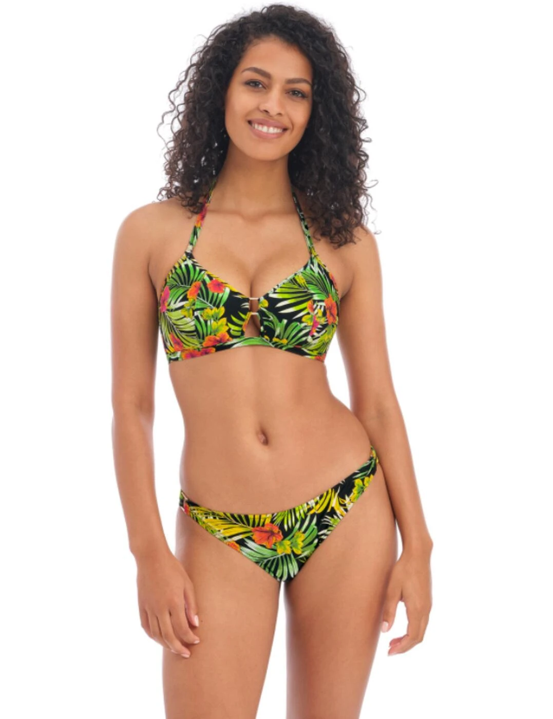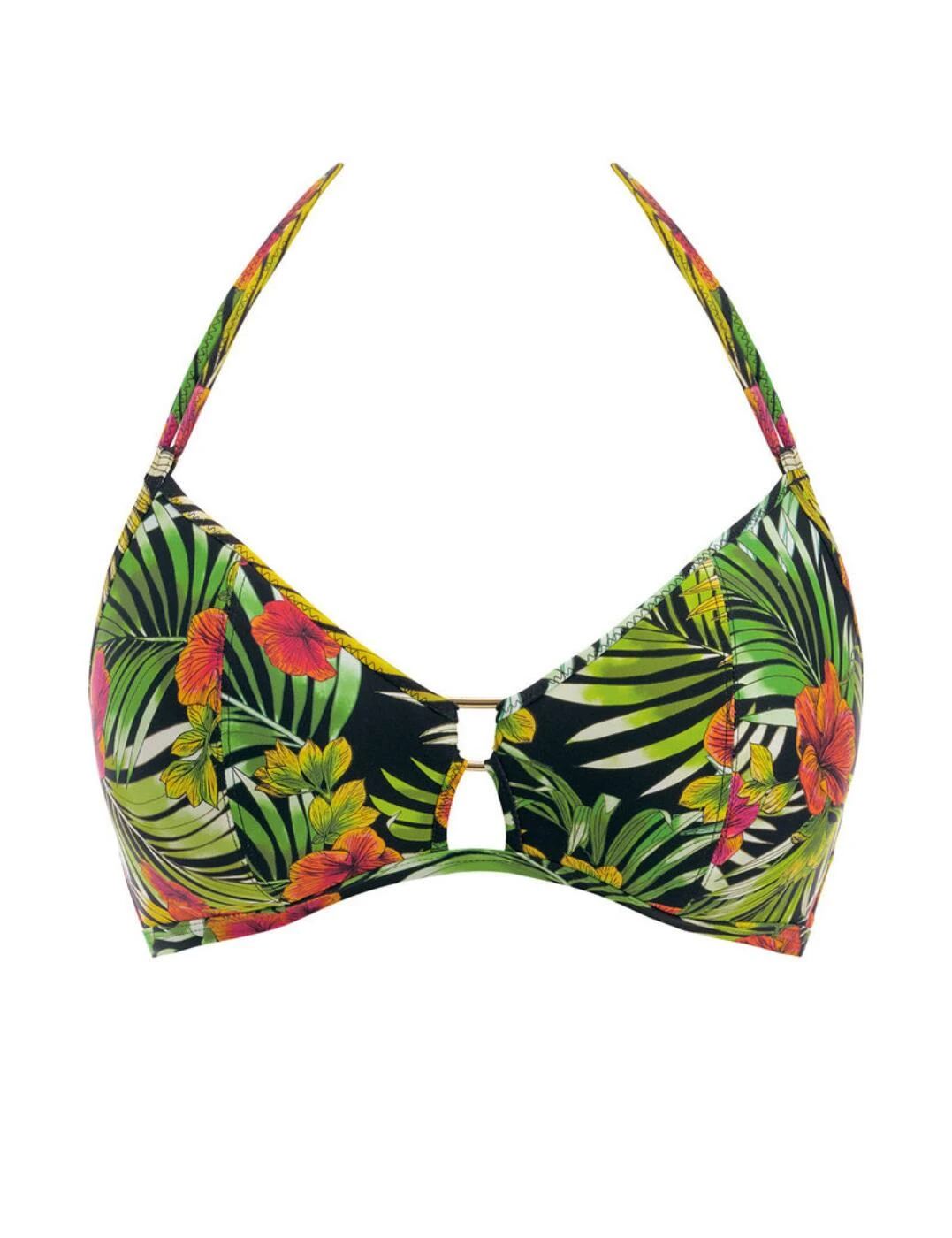 Treat yourself for your next upcoming holiday with this soft triangle bikini top from the Maui Daze range by Freya. Like all the other pieces from this range, that are also available, it is covered in a statement tropical palm print. It has lightly padded cups that create a rounded shape and offers support. It allows for a natural feeling with a wireless design and medium coverage. There is an eye-catching gold square charm in the centre along with a cut-out underneath that showcases your cleavage. It has halterneck tie straps and closes at the back with a clasp fastening.