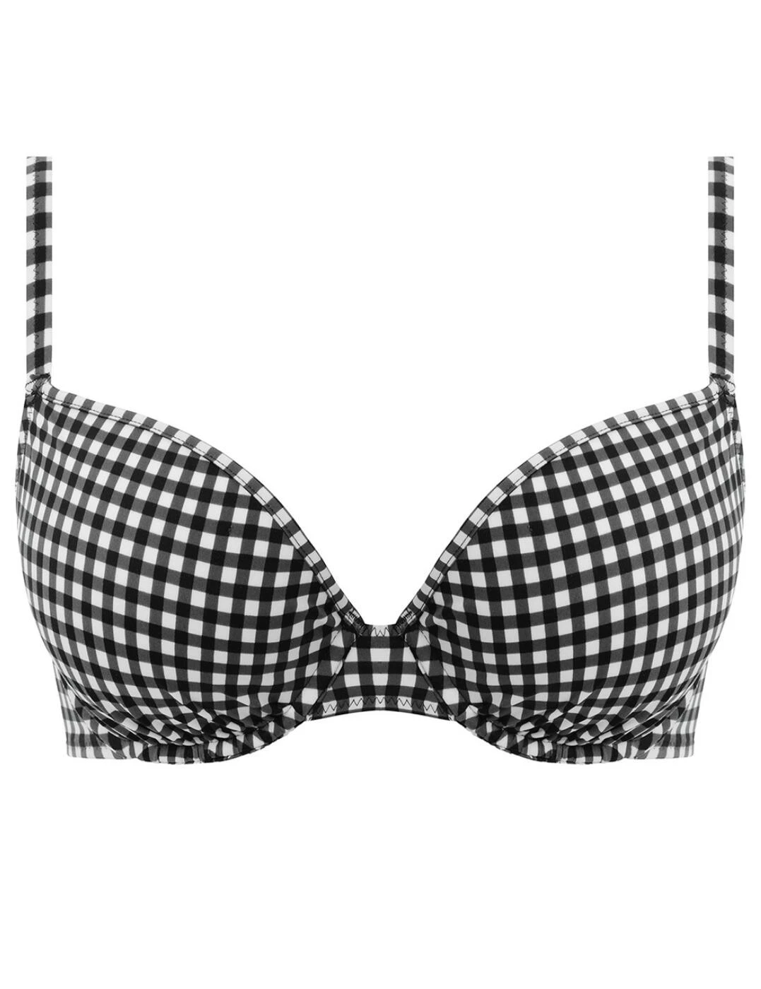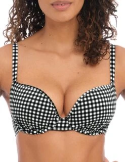 The 60s have returned with Freya’s Check In range. Feel beach ready in this stunning gingham print bikini top. Featuring a teasing plunging neckline and underwired, non-padded cups which all work together to give you a supportive and comfortable yet flattering look to your chest. Adjust the shoulder straps to your preferred fit and close with the secure back clasp. Complete this retro set by pairing it with one of the matching Check In briefs.