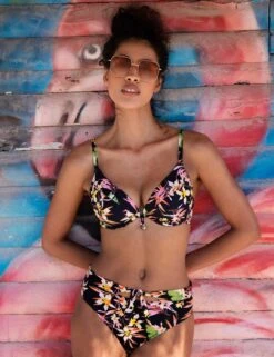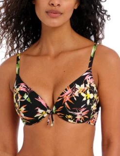 Embrace the tropics with the Savanna Sunset collection by Freya. Strut the poolside in this teasingly deep plunging bikini top embellished in a bright botanical print. Featuring underwired, padded cups which help support and create a volumised shape for your bust. The small tie detail at the centre front adds a feminine flair to this piece. Adjust the shoulder straps to your preferred fit and finish the look by closing the classic back fastening and you’re ready to go! Coordinate into a set by pairing with stylish matching bikini briefs.