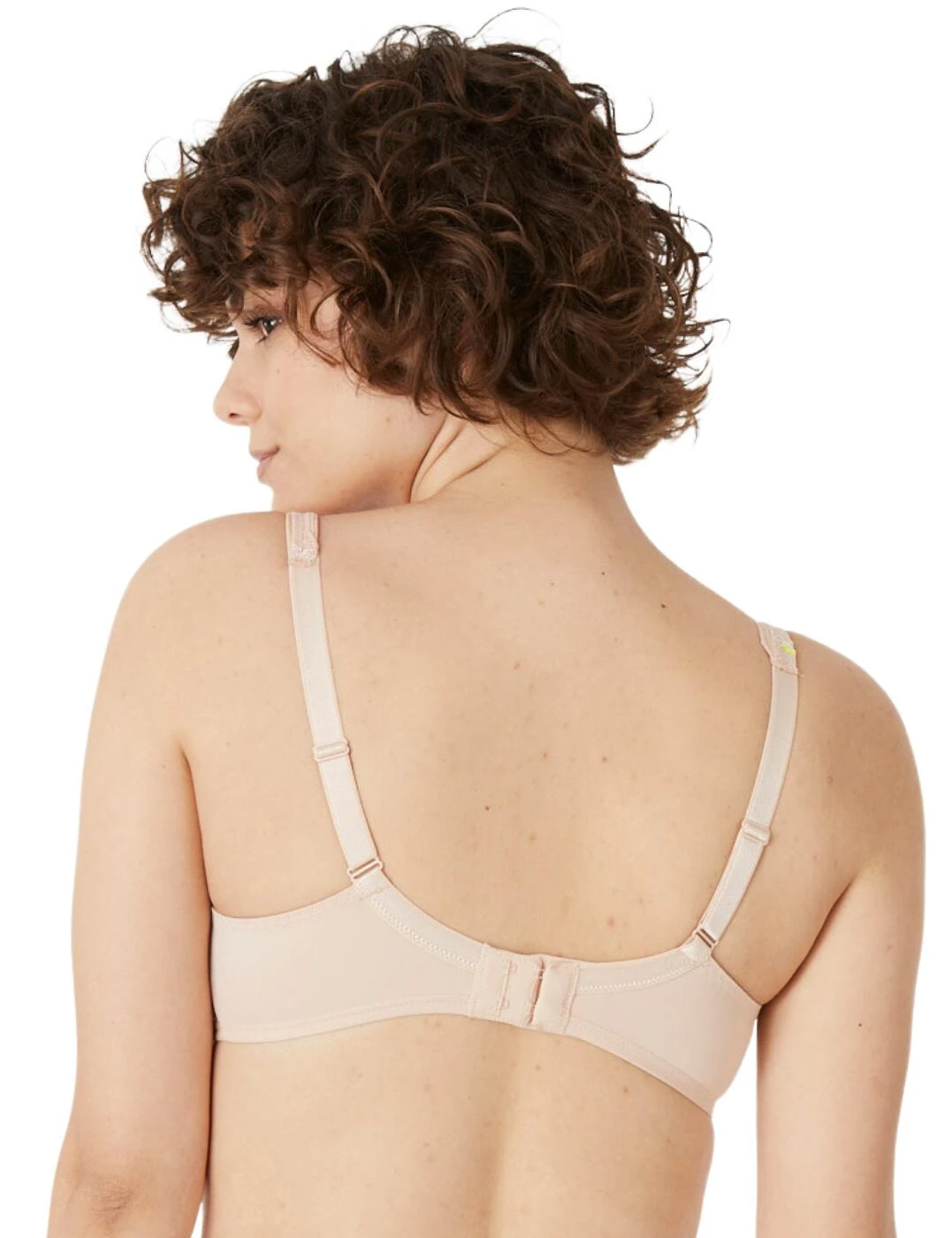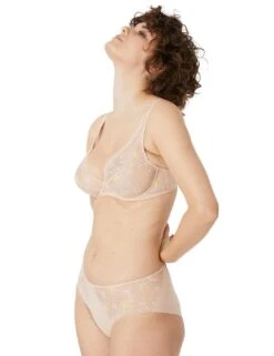 Flatter your cleavage in this beautiful underwired triangle bra from Maison Lejaby. This bra is a part of the Sunflowers range, which brings delicate lingerie pieces with a light and airy feel from the all-over sheer cups with embroidery throughout that has a modern pop of neon. The bra has triangle-shaped cups that create a plunging neckline with an uplifting effect from the feminine shape. It ensures a comfortable and supportive fit with the underwire, stretch knit fabric, hook and eye closure and adjustable straps.