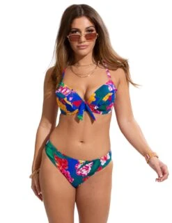Brighten your suitcase with Pour Moi’s Antigua collection this season. Lounge in this tropical-inspired print bikini top for the ultimate holiday look. Featuring underwired, padded cups that come to a flattering plunging neckline so you can show off your gorgeous curves. Centred on the bust is a small bow followed by a frill detail on the cups for a feminine design. Adjust the shoulder straps to your own preference for comfort then close it with the classic back clasp. Couple this trendy bikini top with some of the coordinating briefs also found in the Antigua range.