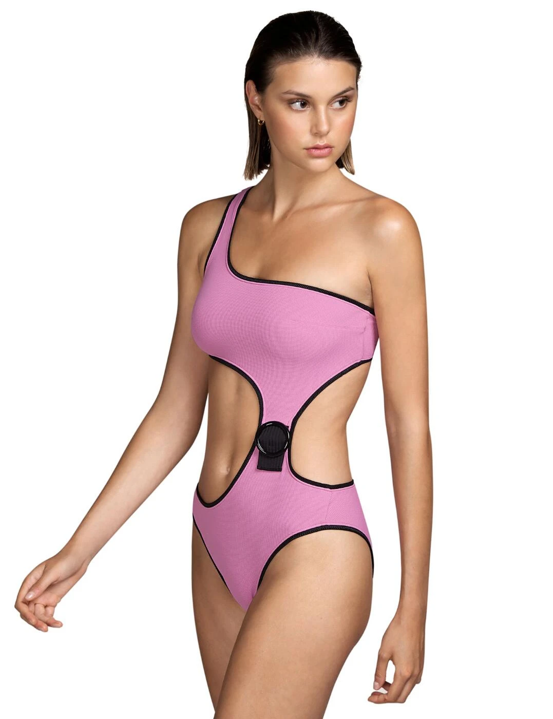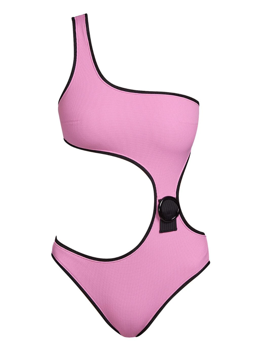 The Coco range by Andres Sarda introduces fun retro swimwear with a piping detail that will leave you feeling confident at the beach. This special swimsuit has an eye-catching asymmetric design and features large side cut-outs as well as an open back. It has a popular one shoulder strap design. The swimsuit closes at the rear with a clasp closure and provides medium rear coverage. Finished off with the signature Coco circle detailing that sits in the centre of the swimsuit.
