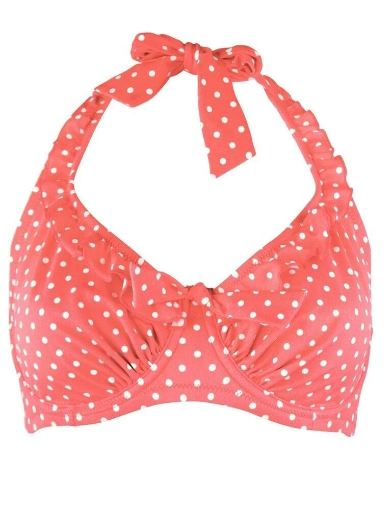Look hot in spots this season with the brand new Pour Moi Hot Spots halterneck bikini top. With a retro vibe and delicate detailing, this range is a must-have for the perfect getaways. This bikini top features a classic halterneck design, meaning it secures around the neck with scarf ties. Crafted from smooth and soft fabric adorned in a fun polka dot print. Finished off with a playful frill detailing on the upper cups and a dainty bow at the centre panel. Pair with matching coordinates for a fun beachy look!