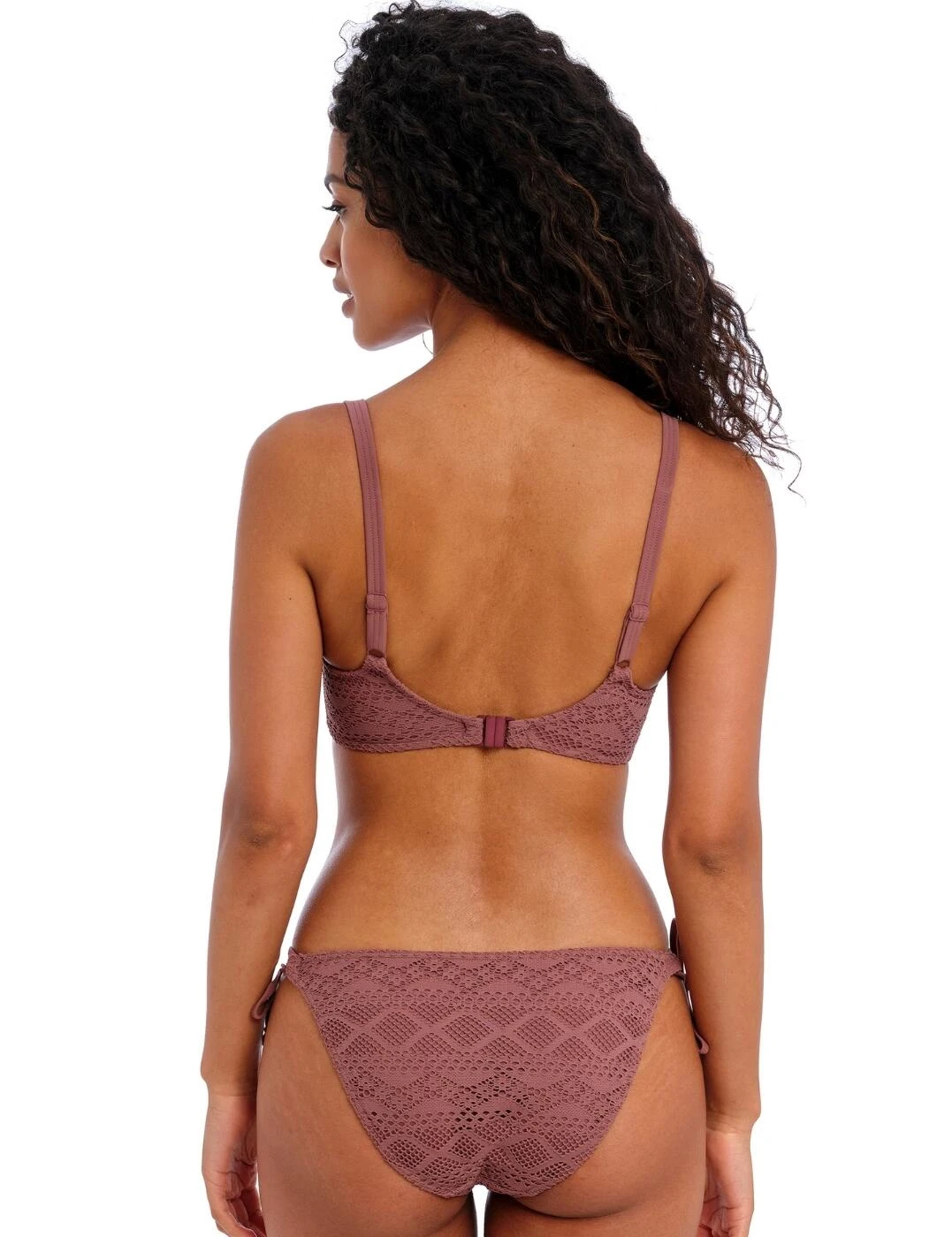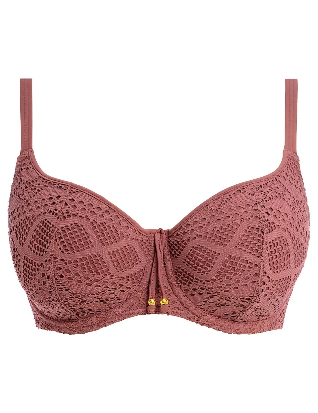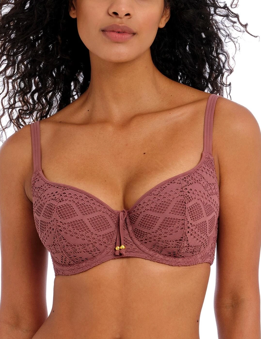 Feel the ocean breeze in this stunning bikini top, a hallmark in the Sundance range by Freya. Featuring underwiring and lightly padded cups help give extra shape and lift to your bust, enhanced further by the flattering sweetheart neckline. Dainty feminine details include the tassel detail in the centre front of the bust which is embossed with metal beading. Complete the fit by tailoring the adjustable shoulder straps to your desired length and fastening the classic back clasp. Match this piece with one of the coordinating items also available in the Sundance collection to create your own classic set.