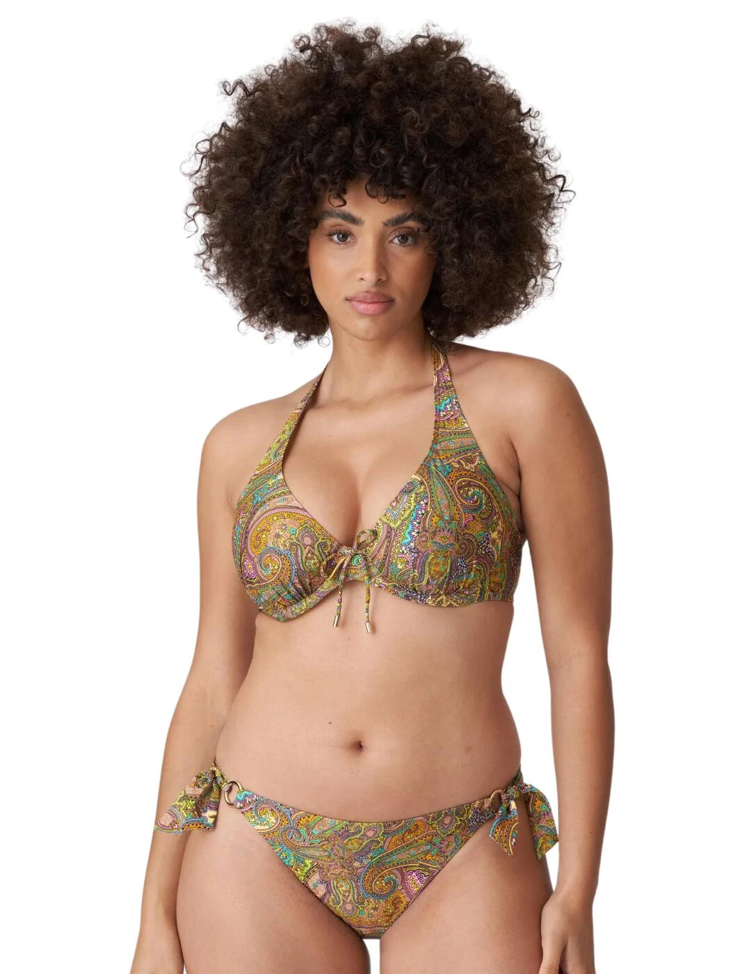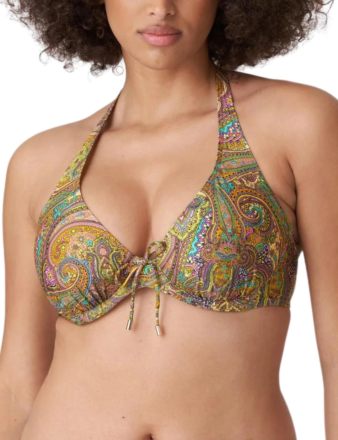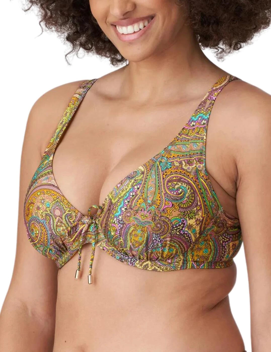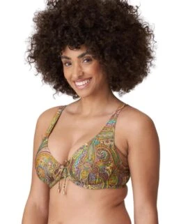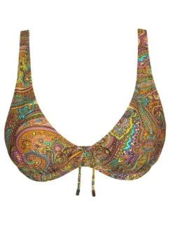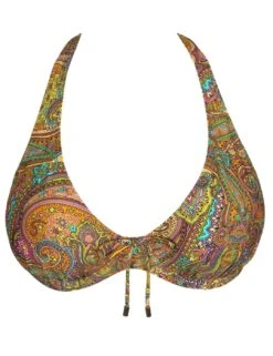 This plunge bikini top by Prima Donna’s luxurious Sakarun line boasts a sexy and flirty design that is perfect for someone who wants to feel amazing at on their next getaway. This bikini is half-padded and is underwired for the best and most stunning support and uplift to your bust. This piece has a multiway adjustable strap that converts from a traditional shoulder strap to a classic halterneck. The design features a secure clasp fastening and a beautiful print with a tie bow detail in the centre bust creating that unique finish. To complete this set, snap up the matching available coordinates from Prima Donna’s stylish Sakarun range.
