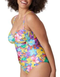 This flattering and timeless full cup control swimsuit by Prima Donna’s Sazan line will make you feel confident all day long making this piece a must-have in your luxury swimwear collection. This stylish swimsuit is wireless and has moulded cups for the utmost comfort fit while still giving you amazing support. The adjustable straps are convertible to a halter neck and an easy-to-wear pull-on design is perfect for fitting all your amazing curves. The shaping design has ruching on the tummy and centre bust to give you a boost in confidence while still showing off your natural and gorgeous silhouette. Finishing off the look with a stunning floral print for that feminine and elegant style.