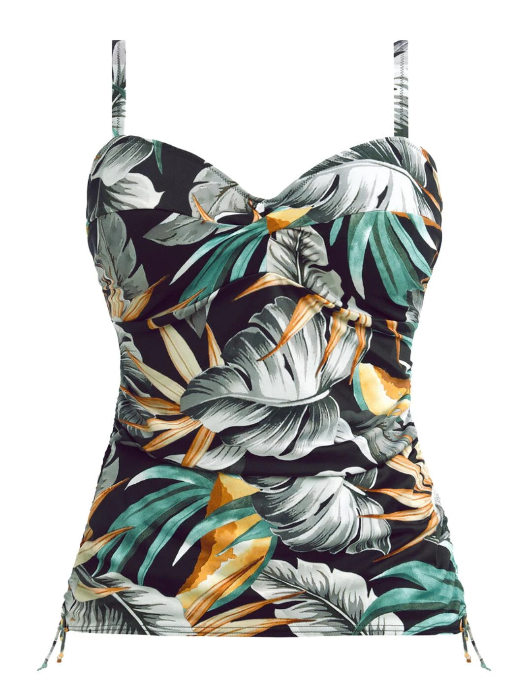 Make a statement when you hit the pool or beach with the Fantasie Bamboo Grove tankini top! This stunning tankini is perfect for plus-size women who want to look and feel their best. The botanical print adds a delightful dose of colour that is sure to turn heads. And, thanks to the adjustable straps, this top fits perfectly to your individual shape. Constructed with lightly padded foam cups, concealed underwiring for extra support, concealed hook and eye fastenings and a twist front, this swimwear ensures poolside perfection and comfort! To sweeten the deal even more, there are matching styles of swimwear available which make it easy to create a sophisticated coordinated look.