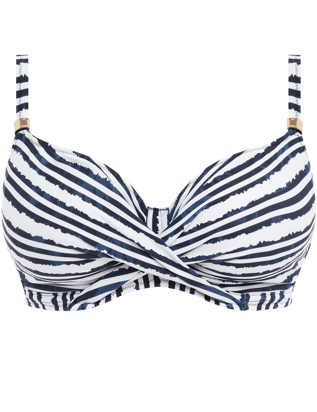 Showcase your beach-ready body with this gorgeous twist full cup bikini top from the stunning Sunshine Coast collection from Fantasie. Concealed underwiring and non-padded cups give a supportive and lifted look that embraces your natural curves. Adjustable straps and a clip fastening on the rear create a tailored fit that is secure and hugs your curves perfectly. This design has a flattering stripe print and metallic details with a branded logo detail finishing off this look perfectly. To complete this stylish set, snap up any of the matching available coordinates from this collection now.