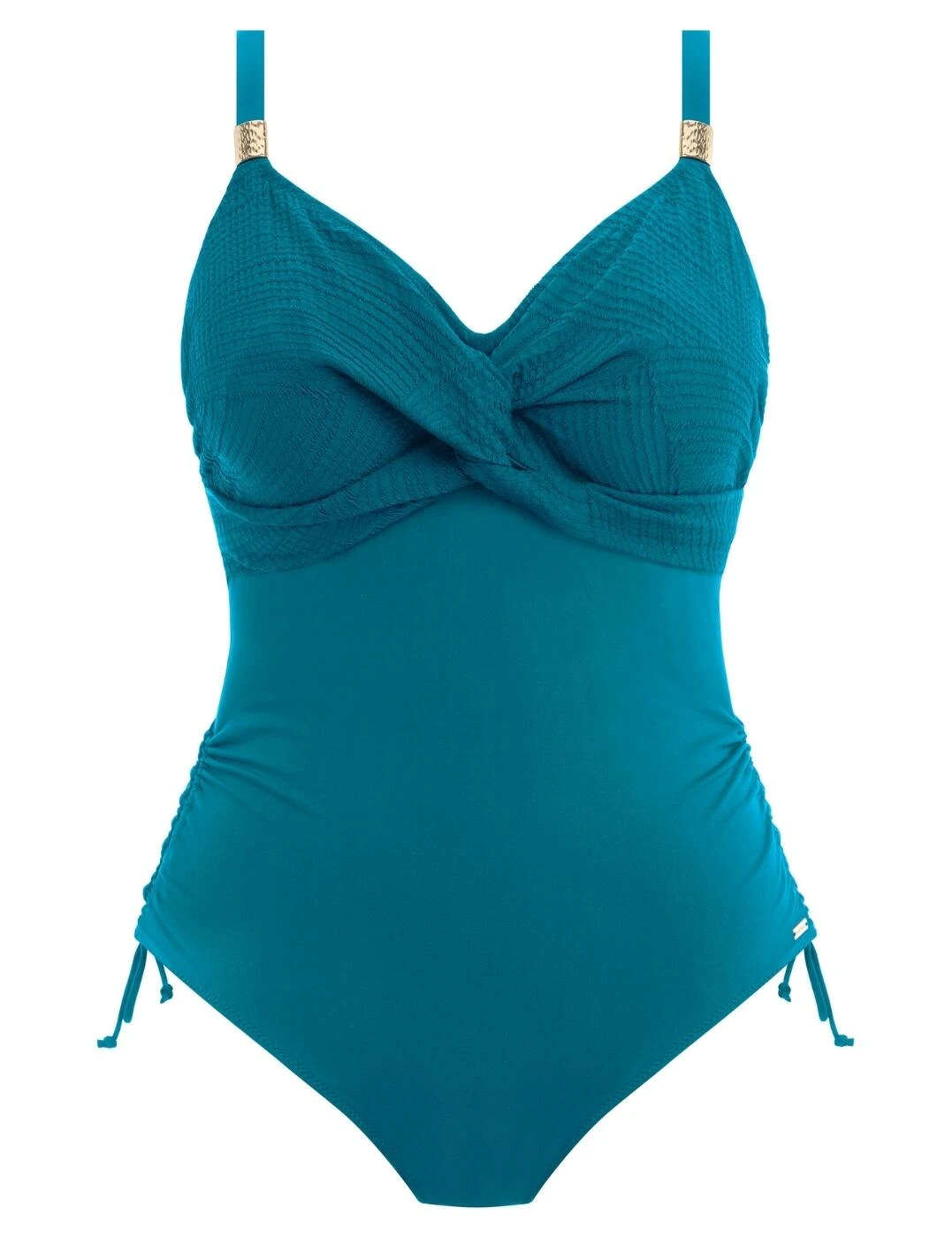 Make a splash looking and feeling fabulous in the Fantasie Ottawa swimsuit! This stunning one piece swimsuit features a flattering V-neckline, twist front detail with metallic accents, and adjustable tie sides so you can customize your fit. Constructed with Fantasie’s signature banded tab this pull-on design has non-padded cups and moderate rear coverage to provide additional support and comfort. The low scooping back creates an elegant look while the adjustable shoulder straps allow for an individual fit.