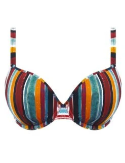 Catch everyone’s eye in the new Bali Bay range by Freya, featuring this moulded bikini top. This stunning design contrasts bold colours in stripes to form a truly exotic look. The moulded cups fit perfectly and are soft for maximum comfort. Based on Freya’s best-selling deco shape, the low front offers good cleavage and means that you can minimise those tan lines! Underwired for maximum support. Secures at the rear with a plastic clasp. The straps are adjustable to get just the right fit. Pair with matching items from the Bali Bay range for a fun day-at-the-beach look!