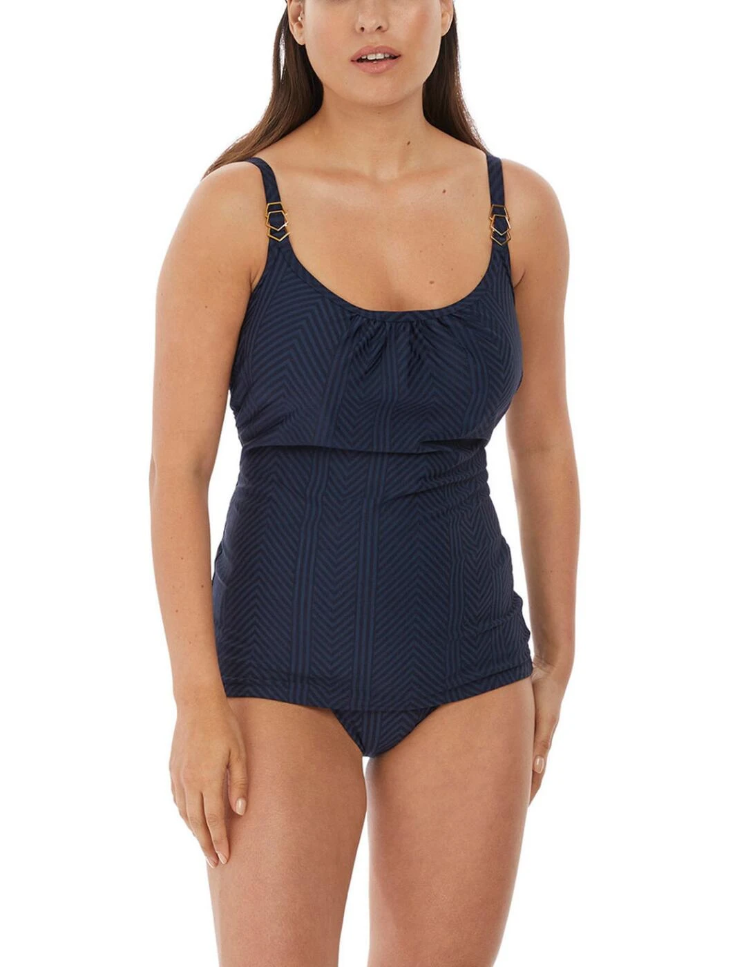 Meet the newest addition to your swimwear. This scoop neck tankini top comes to you from the Long Island collection by Fantasie. Whilst the cups are non-padded to ensure a lightweight and natural-feeling fit, they do include underwiring. This offers you gentle support and a secured lift. Gentle gathers along the scooping neckline offer a feminine touch as well as ensuring a full-cup style. There is concealed support within the bodice of the piece to help with a smoothing appearance. Fully adjustable straps allow for flawless personalisation of fit. To add extra elegance to the piece there are gold adornments and a subtle chevron print.