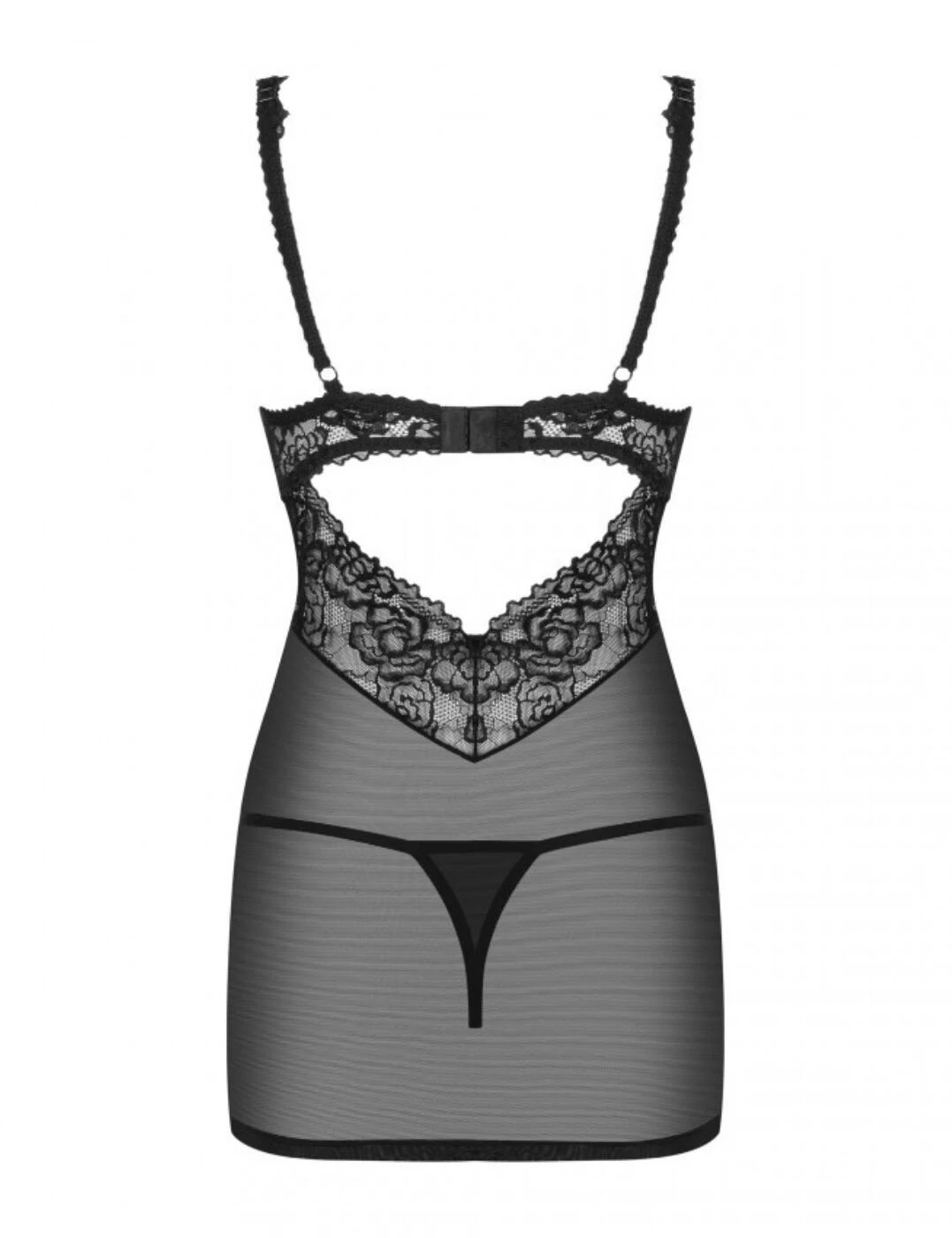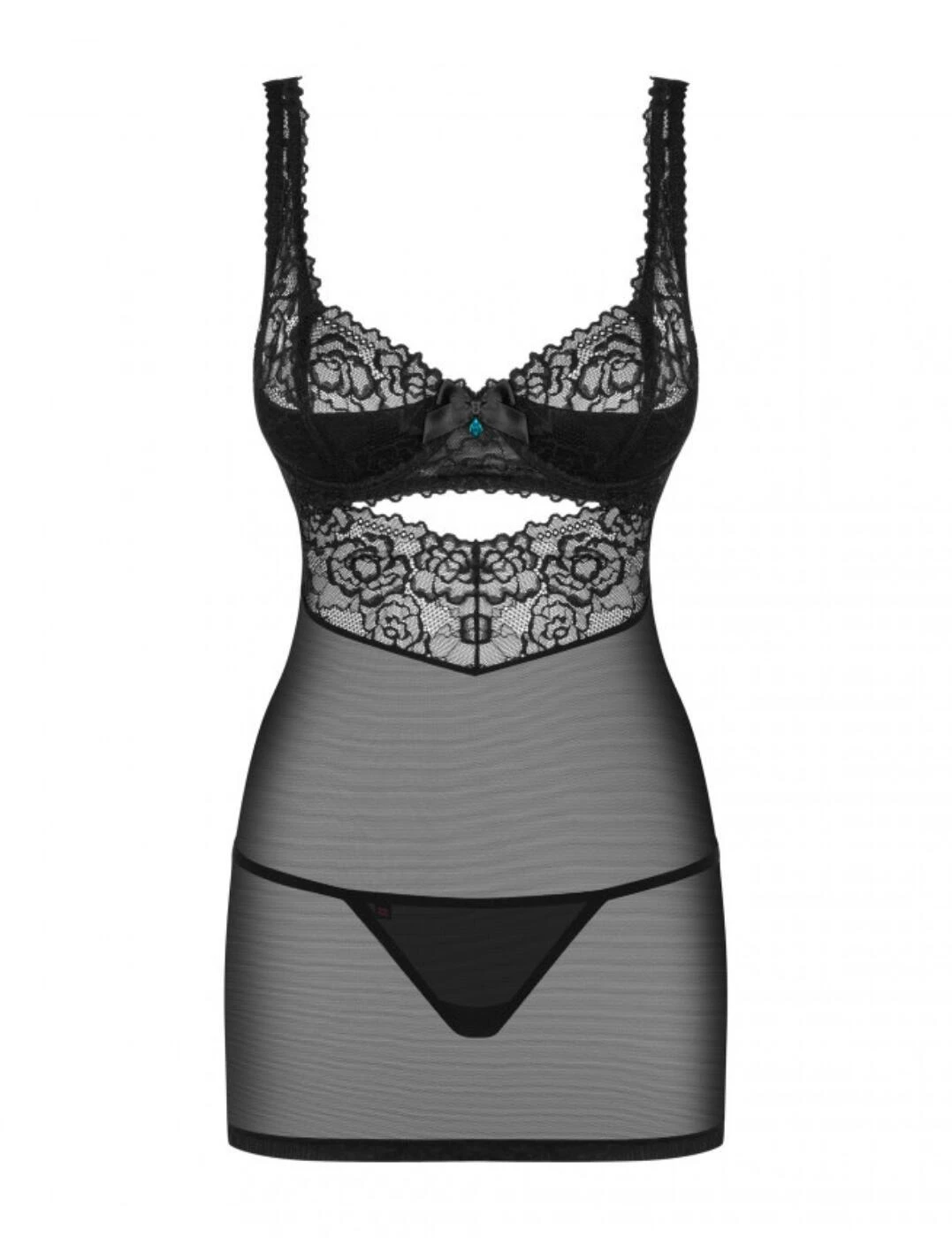 Treating yourself never felt better with this sexy chemise and thong set from Obsessive. The chemise guarantees a good time with an all-over sheer mesh with flirty lace and cut-out sections under the built-in bra both front and rear. It has half-cups that are padded and underwired which emphasizes your bust whilst providing great support. The chemise has adjustable lace straps and closes via a hook and eye closure. This thong is low-waisted and covered in sheer mesh with sexy string sides. Made complete with a large satin bow in the centre of the bra.