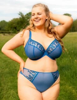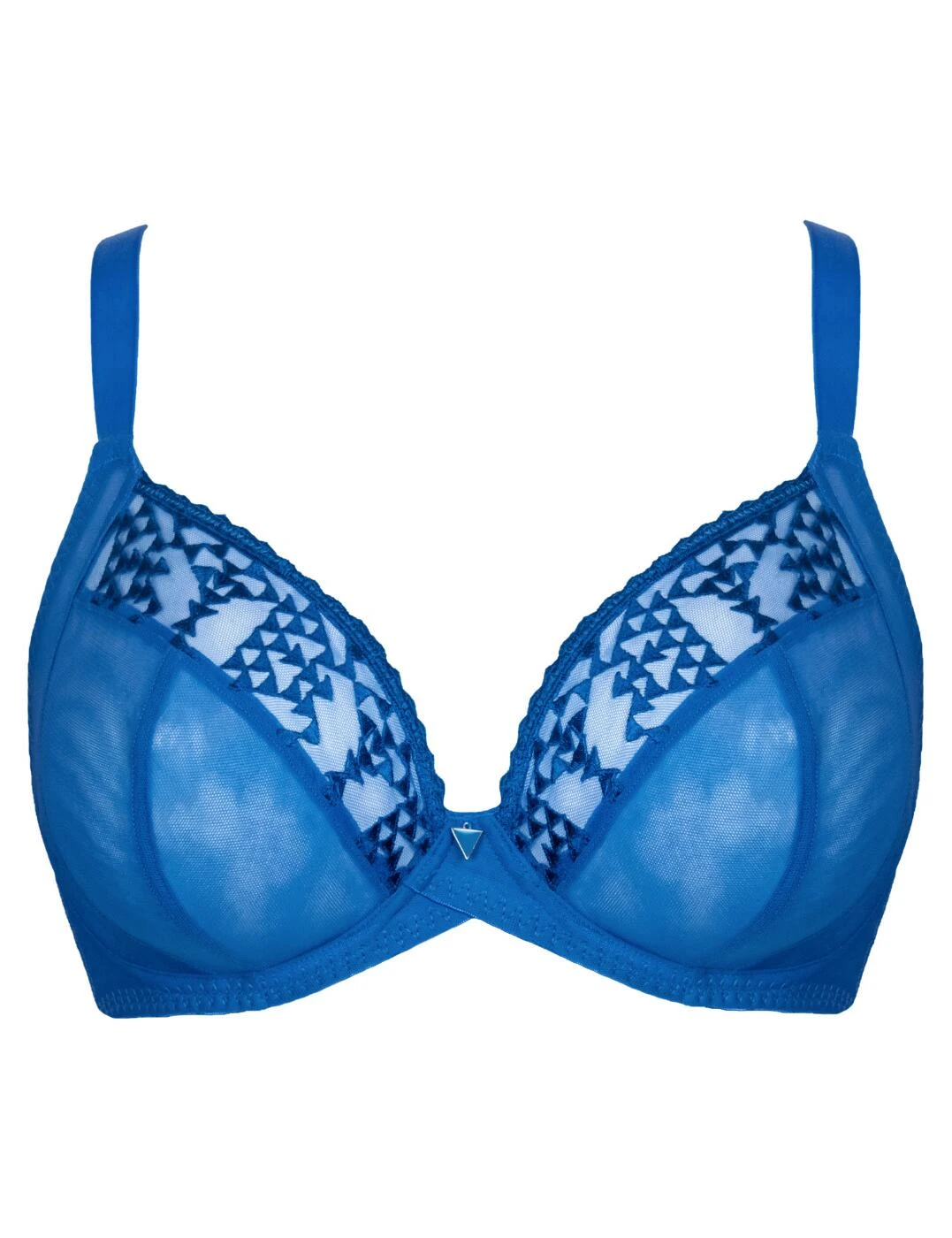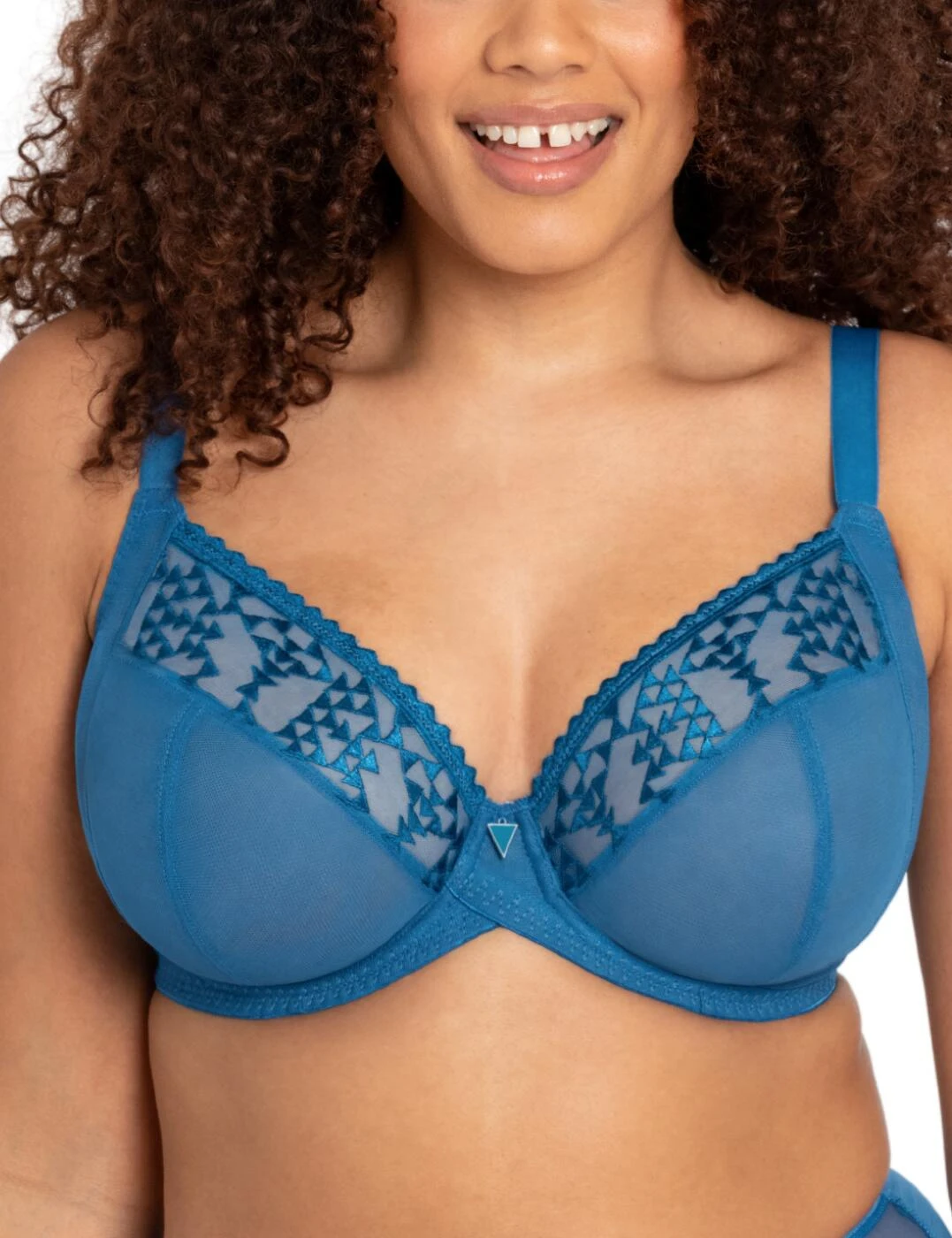 Take Centre Stage and ooze confidence in this stunning bra from Curvy Kate. The 4-part cups are designed for the utmost comfortable experience, with the side support panels making sure that even the bigger busts look effortlessly amazing. The semi-opaque material is accentuated on top of the cups with an intriguing geometric embroidery, with matching cute triangle hardware in the centre of the chest. The underwire supports your bust, with the wide band and a hook and eye back closure giving you comfortable reinforcement. The adjustable shoulder straps feature an additional J-hook for an option of a racerback design.