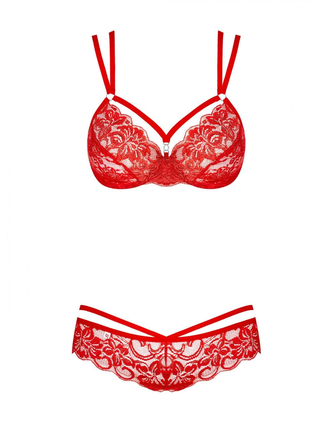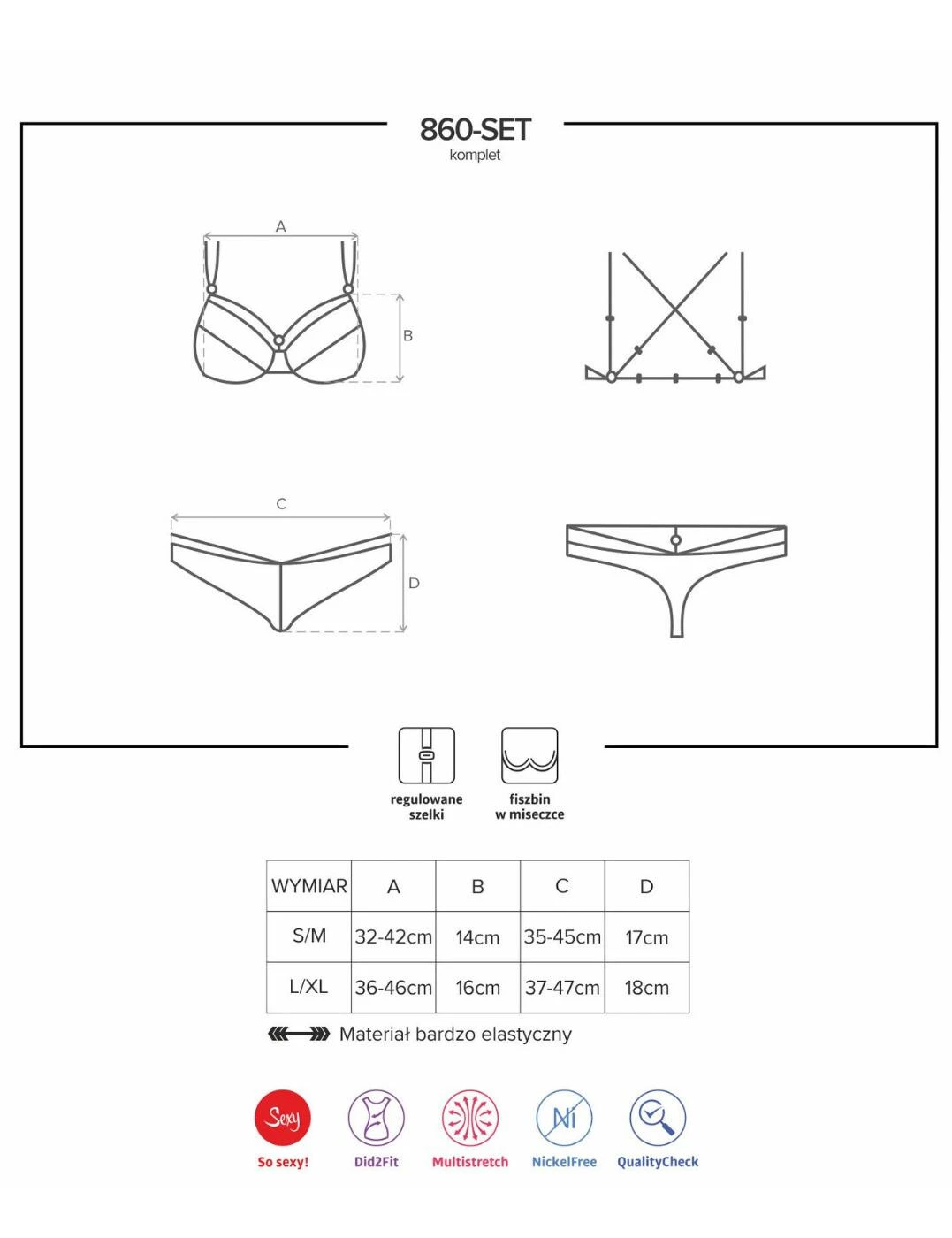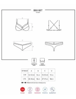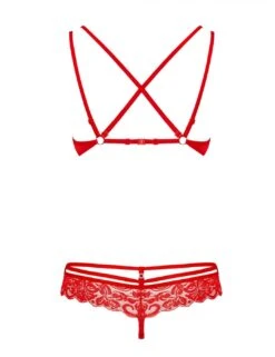 The perfect set for the perfect night! A raunchy underwired bra, that perfectly uplifts your cleavage and decorates it in rose print lace. Strapping detailing can be seen on the back of the bra which descends to the centre of your bust, joining at a centred pendant creating a tantalising look. The same detailing can be seen around your waist before joining the brief and encasing your derrière in scallop trim lace. The cut perfect highlights and accentuates the curves whilst boasting the rest of your figure.