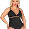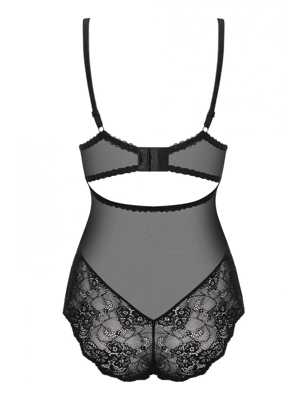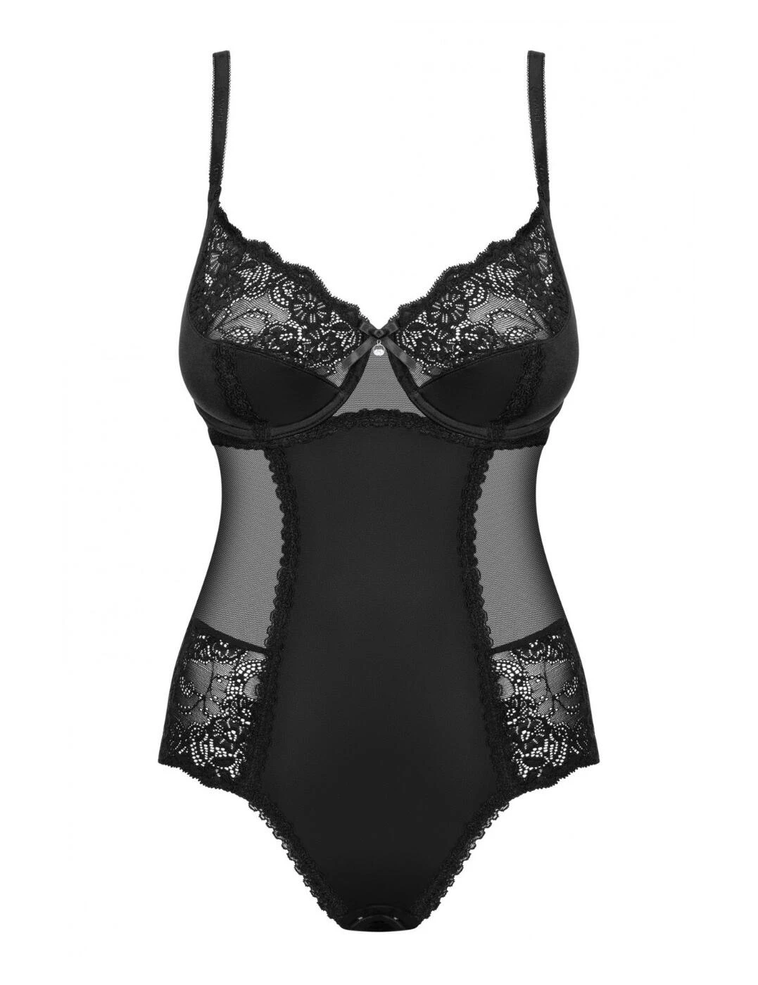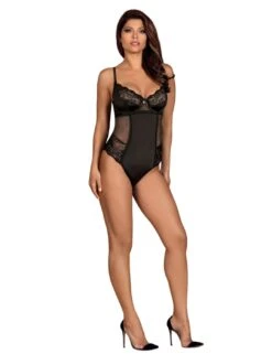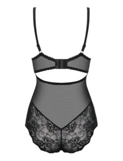 Feel fun and flirty in this mischievous teddy from the Amallie collection by Obsessive. A slimming panel design runs down the middle of the piece, each section delicately encompassed in scallop trim, before blending into a mesh segment to expose your skin. It joins to elegant lace at the rear, coating your derrière, making the piece even more delectable. A small open back exposes a bit more of your skin, before joining at the hook and eye closure. Underwiring in the cups, combined with padding, offers you the perfect lift and frames your cleavage deliciously.