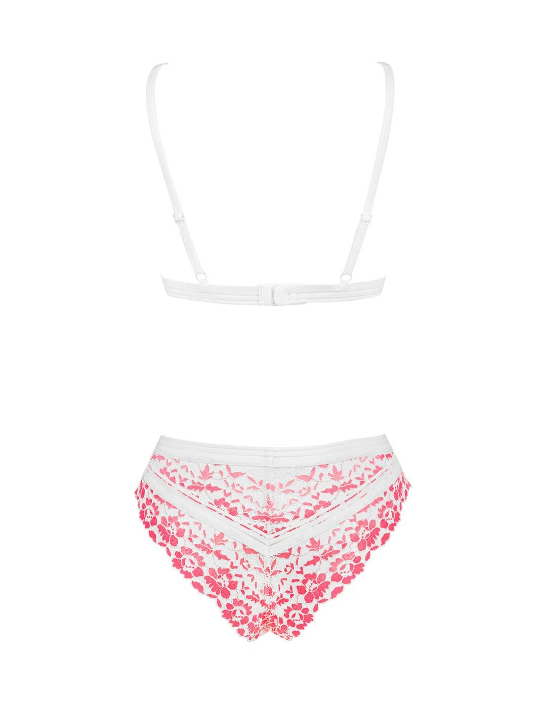Let your confidence shine in this dreamily romantic piece. Contrasting floral patterns layered on top of white luxurious lace create an elegant and tempting look. No padding or underwiring is styled in the piece for optimal comfortable, as well as a more intimate look. Scallop hems around the brief helps deliciously frame your derrière, whilst the small jewelled adornment adds a sparkly element to catch the eye.