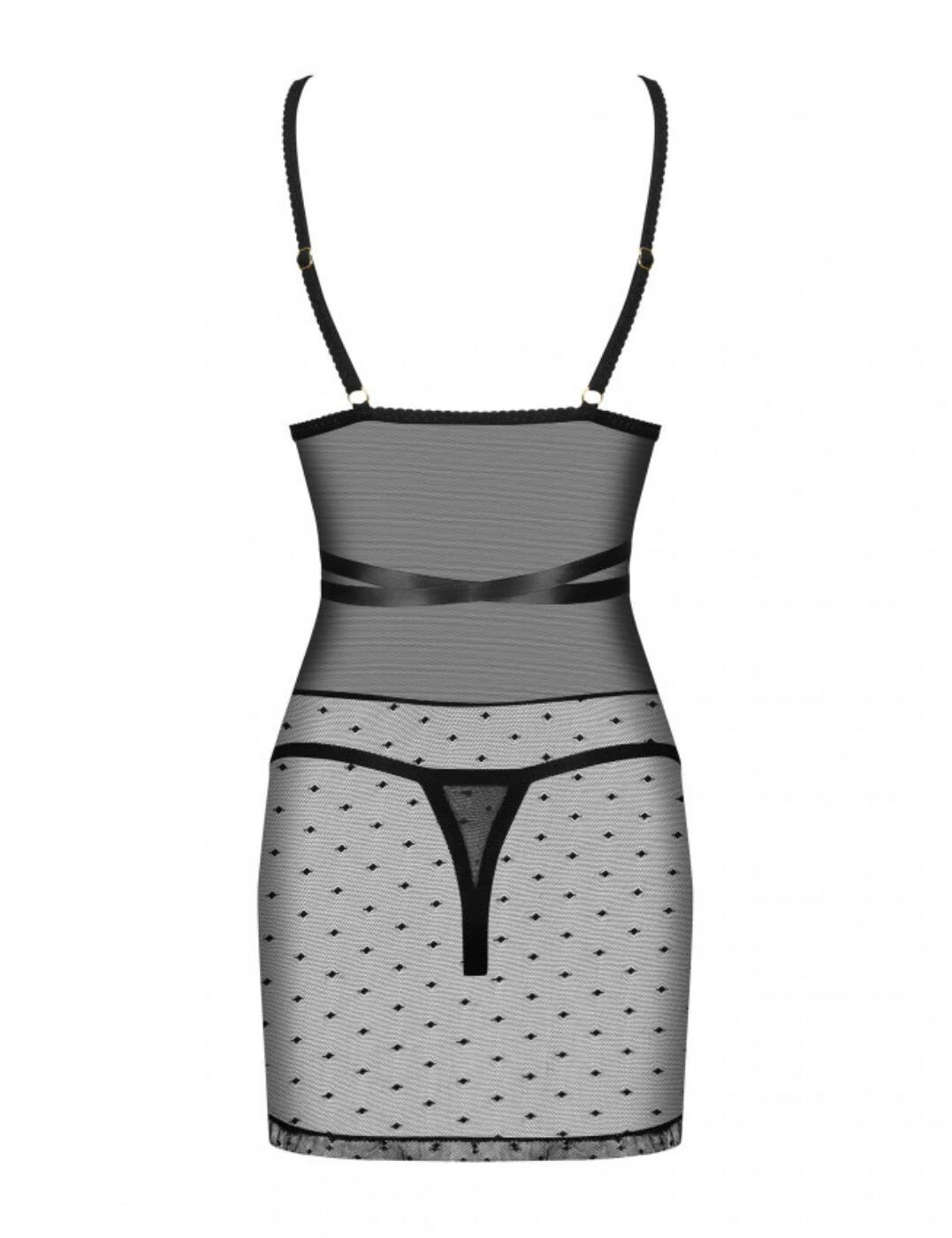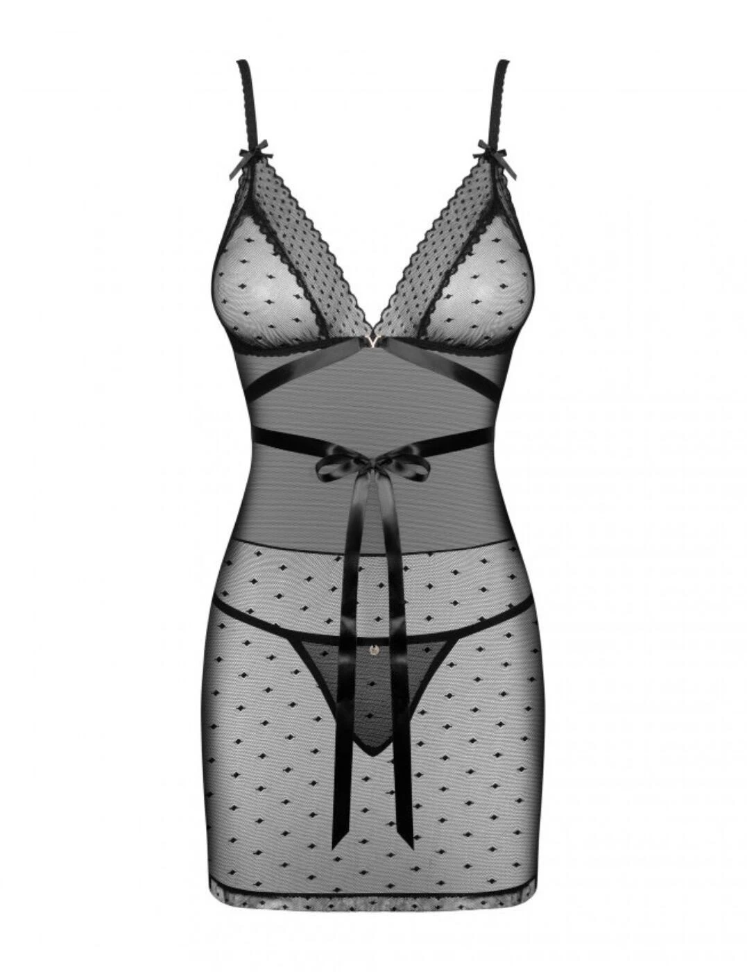 This chemise and thong set is the ultimate feminine piece and will definitely grab your partner’s attention. From the Bowessa range by Obsessive, it features triangle-shaped cups that are made from a polka-dot mesh with lace edging whilst the waist has a darker mesh and the polka-dot mesh is at the lower section of the chemise. It has an easy-wear design with a pull-on style and adjustable straps. The chemise has flirty little detailing with mini bows on the straps, a gold charm in the centre and a large satin ribbon around the waist. Paired with a mini thong to create the look.