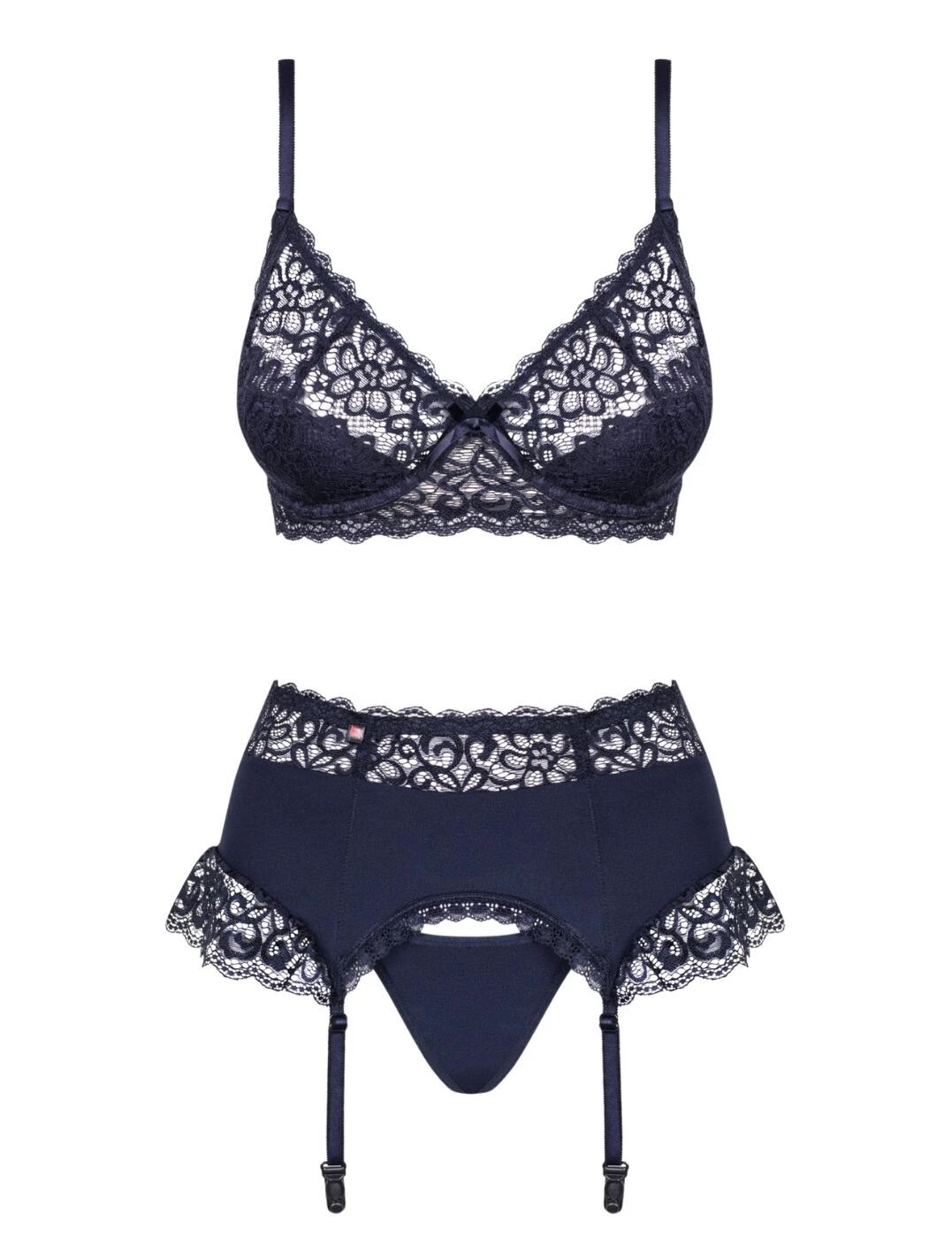 - Three-piece set including bra, garter belt and thong