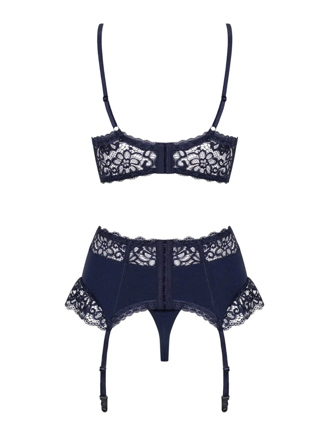Have a love affair with Obsessive’s Drimera collection this season. Guaranteed to give you a night to remember this three-piece set consists of a gorgeous lace bra, garter belt and thong. This set features delicate floral lace accents throughout for a beautiful feminine effect. The bra boasts underwiring and comes to a plunging neckline for a seductive look. Shoulder and garter straps are fully adjustable so you are able to tailor the fit of this set to your own preference. Thong comes to a classic minimal rear coverage with a minimalist low-rise waist to complete the look.