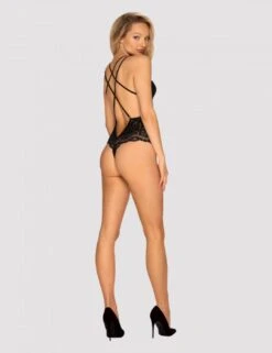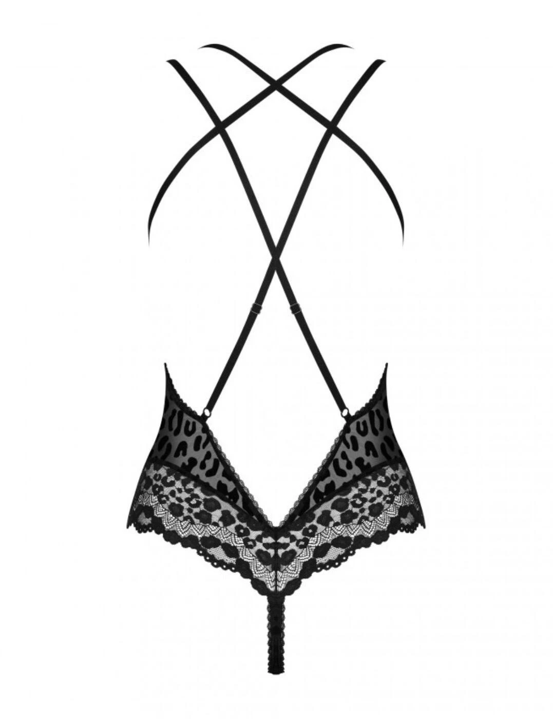 If you want to guarantee a fun night you need this sexy teddy from the Giully range by Obsessive. Covered in sheer fabric in an animal print with a mixture of velvet and lace materials that will leave anyone wanting a closer look. This teddy has plunging cups and features a feminine pendant in the centre. The teddy closes at the crotch and has adjustable straps across the open back in a geometric pattern.