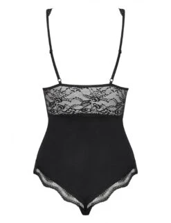 A classic black teddy brought to you from the Luvae collection by Obsessive is bound to get some heart beats racing. A high-apex styling creates a deep plunging neckline, drawing the eye to the perfect uplift thanks to the underwiring. Your bust is framed in scallop hem lace creating an extremely feminine look. A black body creates a slimming look, whereas the lace insert at the rear gives the suggestion of a sexy low cut back, whilst obscuring your skin. The teddy is cut in a thong styling to perfectly present your derrière covered in luxurious lace.