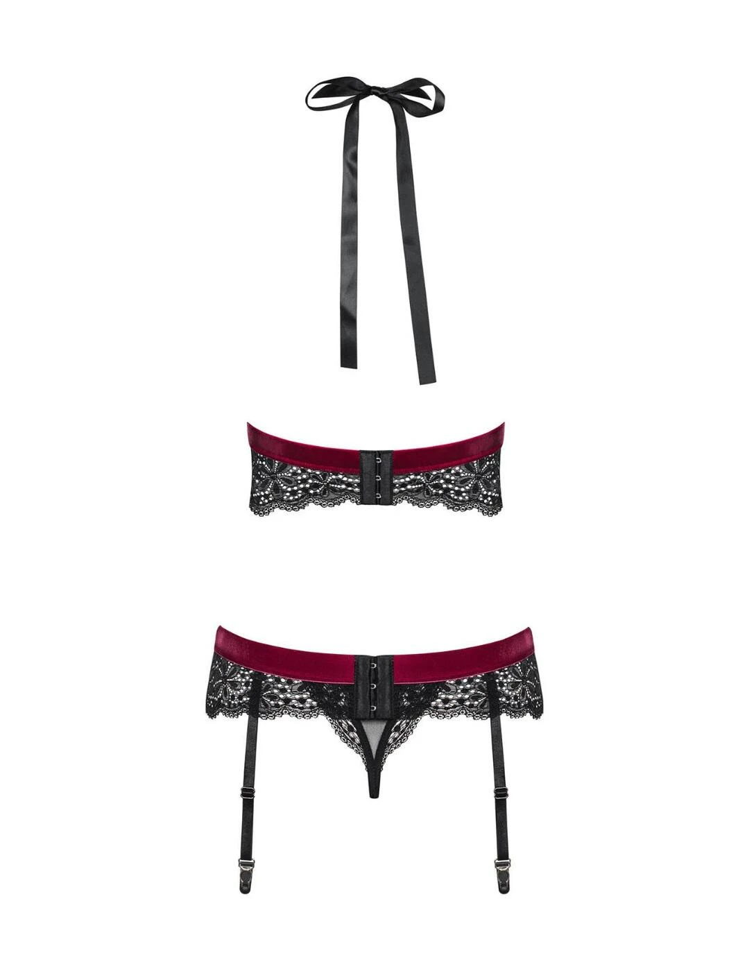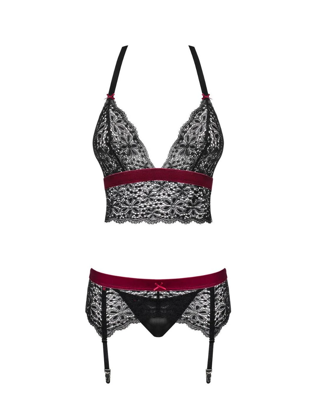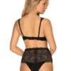 The perfect package for extra sizzle in the bedroom! A longline bralette is the main feature of the piece, with no underwiring or padding it leaves a barely-there feel and an intimate look. All over lace slightly obscures your skin whilst creating intrigue. A deep plunging neckline flatters your bust, encasing it in intricate floral print lace. Finished with a contrasting underband and delicate bows to really make the piece unforgettable. The suspenders descend slightly down the top of your thigh whilst meeting at the waistband at the back to expose your derrière. A thong style brief finishes off the set in satin black