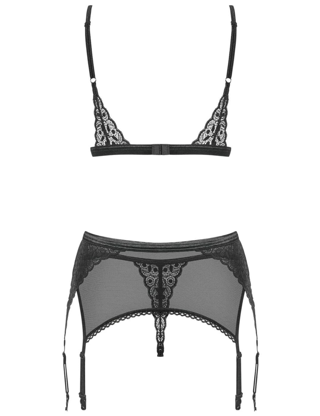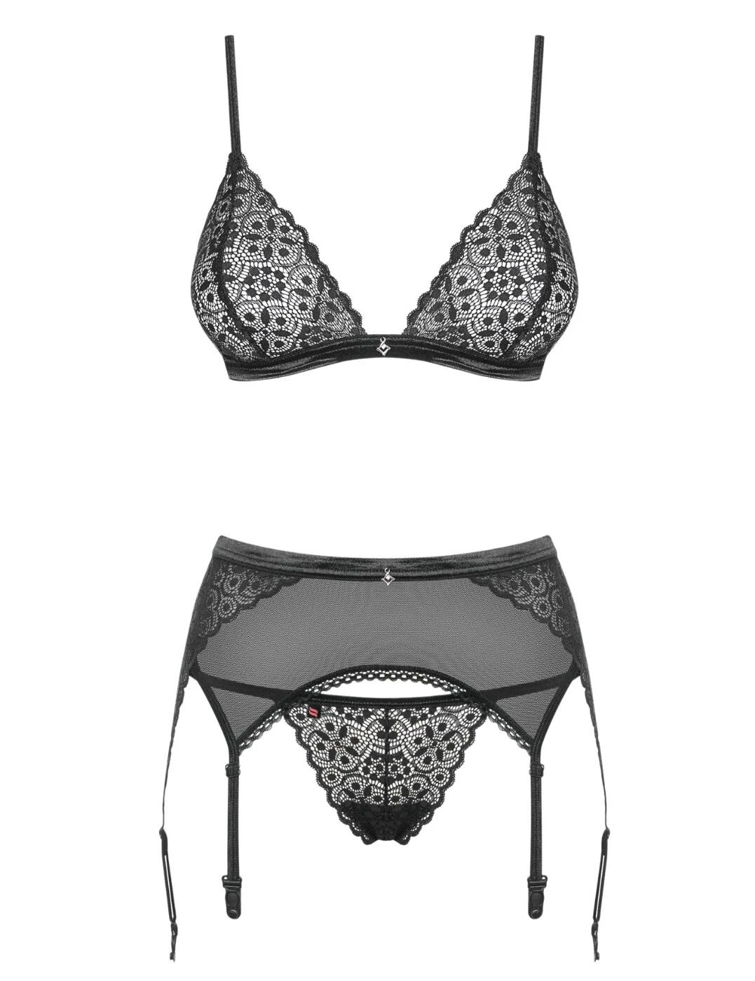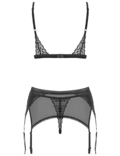 Introduce your inner seductress into the bedroom with this iconic three-piece set from Obsessives’ Shibu collection. This three-piece set includes a gorgeous lace bra, thong and garter belt to give you a complete seductive look that is anything but shy. The bra features a delicate geometric lace design that gives a chic finish to this gorgeous piece. The bra and garter belt are adorned with a matching pendant that gives this set a cute yet flirty look. The bra is fastened at the back with a hook and eye closure and the shoulder and garter straps are fully adjustable for a look you can tailor to your own preference. Included thong has a minimalist look with a classic thong design.