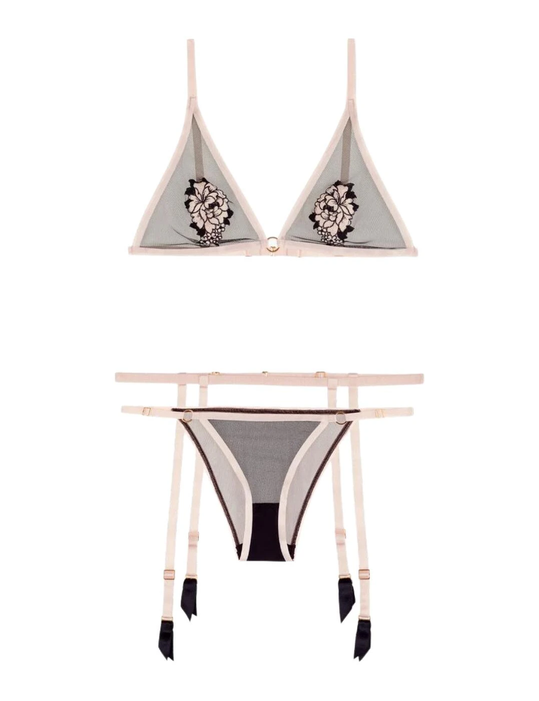 Expect all the attention to be on you when wearing this gorgeous 3-piece set from the Boite A Desir Fleurs Cheries collection by Aubade. The two contrasting colours of the piping and sheer tulle material play off each other and provide a captivating result that will surely catch the eye. The minimalistic triangle cups are decorated with beautiful floral embroidery in the centre, highlighting your decolletage. The briefs feature a comfortable mid-rise waist and moderate rear coverage, while still maintaining the sensual feel of this set with the sheer tulle material, open sides, and contrasting piping. The simplistic suspender belt is made out of luxurious elastic satin straps and features four garter straps. Wear with your favourite pair of stockings for a full look.