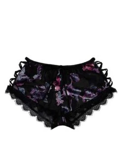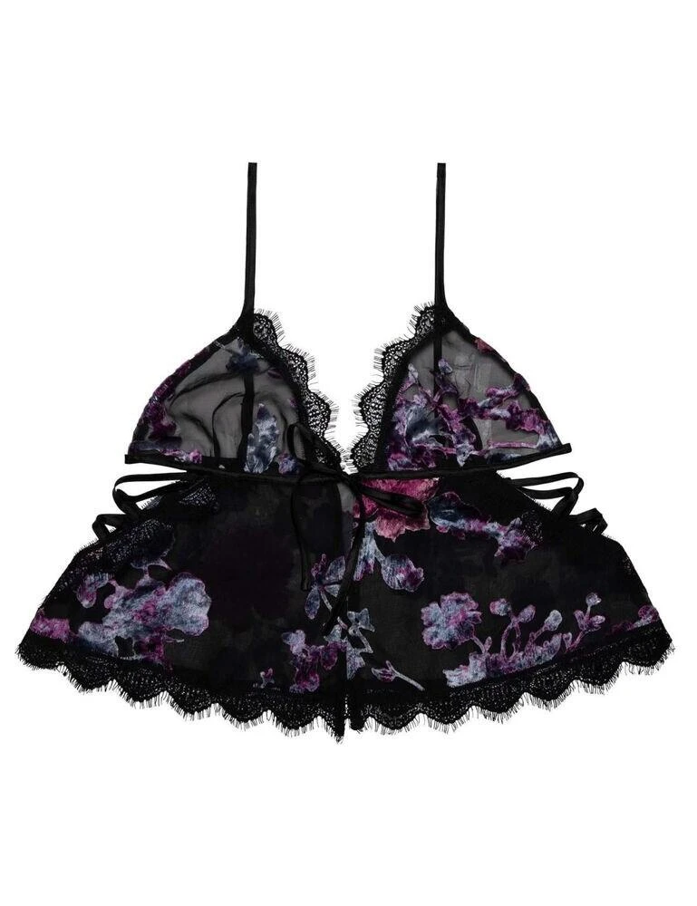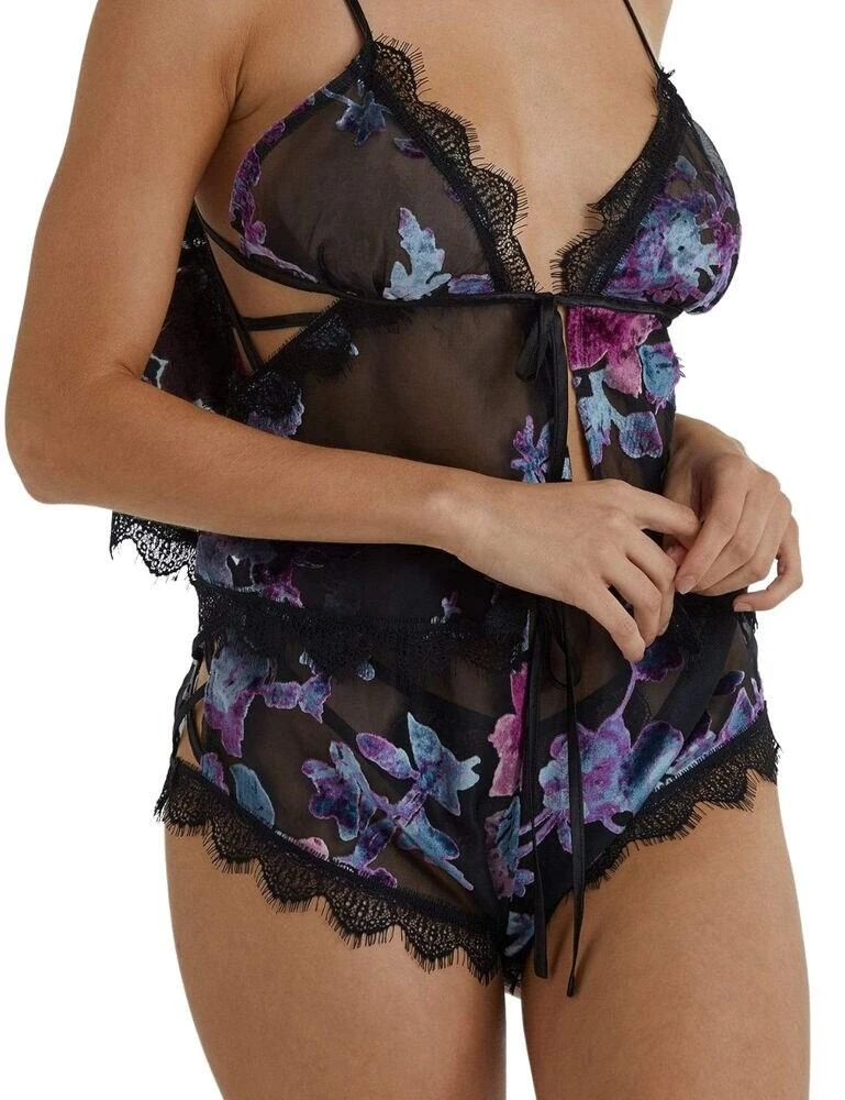 Add some sensuality to your nightwear collection with this stunning two-piece cami and short set from the Frankie Devore collection at Wolf and Whistle. Completely designed in a sheer floral Devore with seductive cut-outs and a front tie, let this set add a peek-a-boo effect to your skin. The edges are trimmed with a lace frill for added detail, with criss-cross details at the sides. They are loose-fitting so feel ultra-comfortable when sleeping.