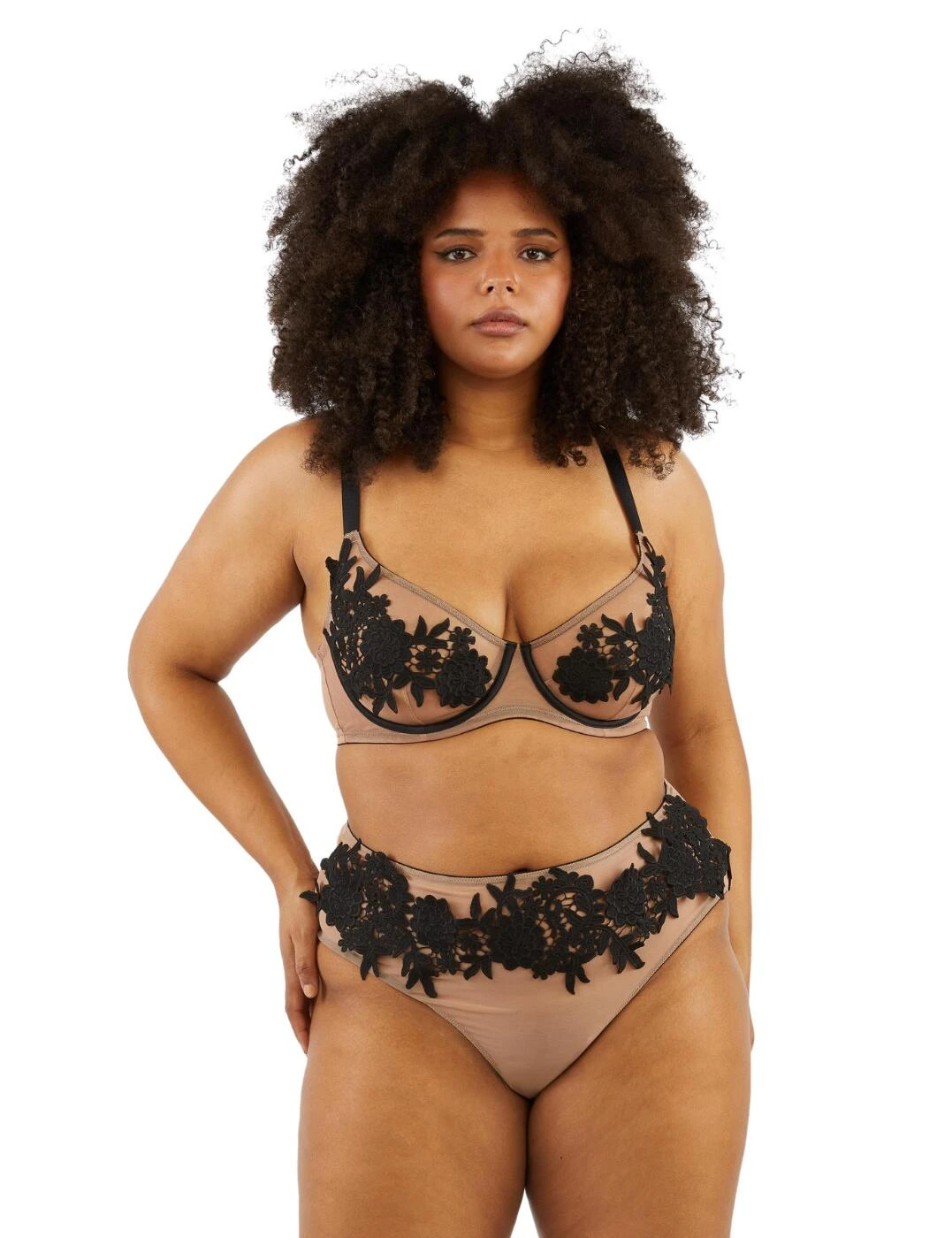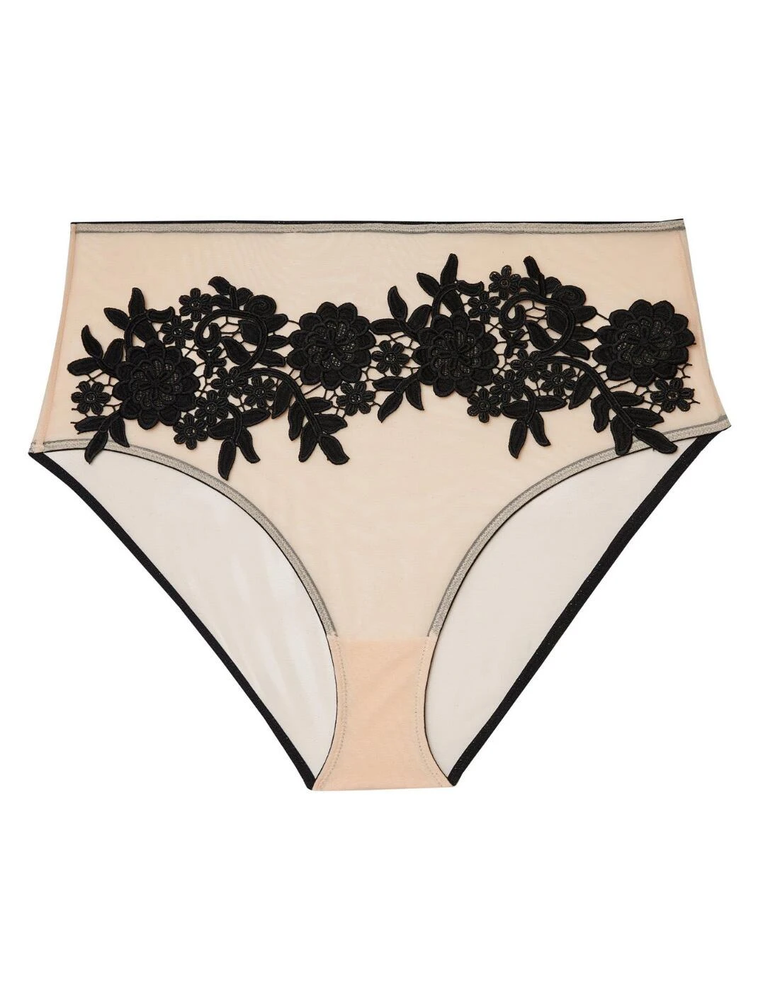 Add some elegance to your lingerie drawer with the Alaina range by Playful Promises. This mesh and black applique brief is a high waisted brief that provides full coverage whilst shaping your curves and creating a flattering silhouette. It creates an illusion effect with transparent materials and a floral lace overlay across the waist. The brief has a sheer mesh back creating a sexy look. It has an elasticated waist that ensures a comfortable fit. Matching items are available.