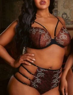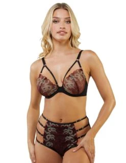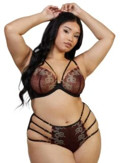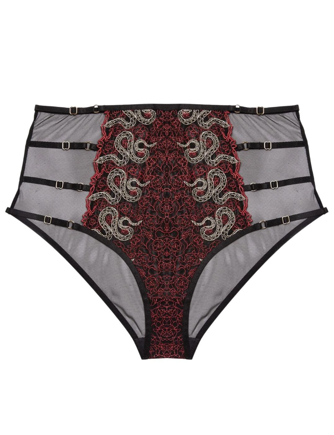 The Dacota collection by Playful Promises is exactly what you need to introduce some sensual pieces to your lingerie drawer. These briefs feature a comfortable moderate rear coverage and high-rise waist with the sheer tulle material on the back tantalisingly showing off your curves. The front is decorated with slithering snakes embroidered on top of a flowery design, giving you the ultimate seductive look. The adjustable straps on the sides show off a bit of skin and add a bold statement to this salacious piece.