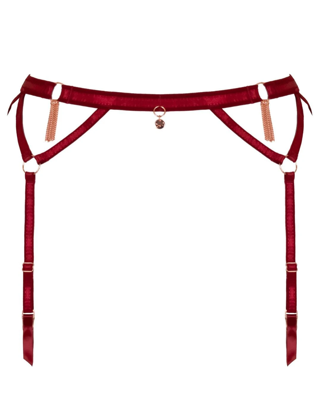 Minimal doesn’t have to mean basic! This Unchained suspender belt from Scantilly by Curvy Kate boasts a sleek and simplistic design. Decorative rings along the waistband and garter straps can be used to attach the decorative chain from the matching bra to create a unique look. The belt features hanging tassels on each ring along the waist. Pair matching lingerie from the collection for a coordinated look.