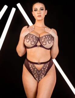 The Lovers Knot thong by Curvy Kate features intricate embroidery that is inspired by the lovers’ knot. The classic high-rise fit sits on your natural waist and features a cut out that exposes the navel. The contrasting hardware on the waistband matches the design of the embroidery. A sensual sheer centre gives a tattoo effect while contrasting sides create dimension and a romantic look. The minimal rear coverage frames your curves giving you a seductive appearance.
