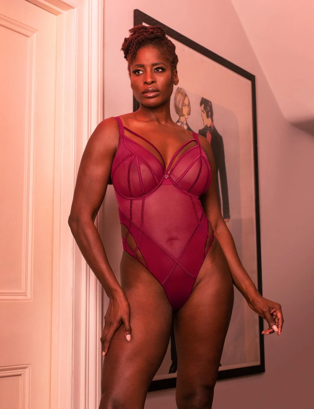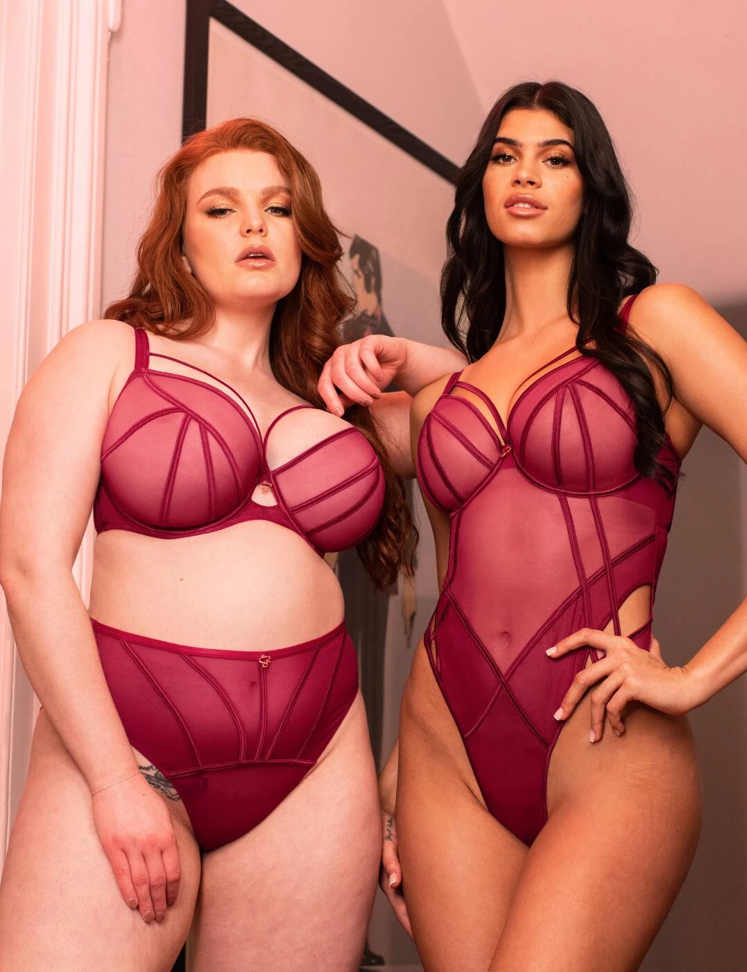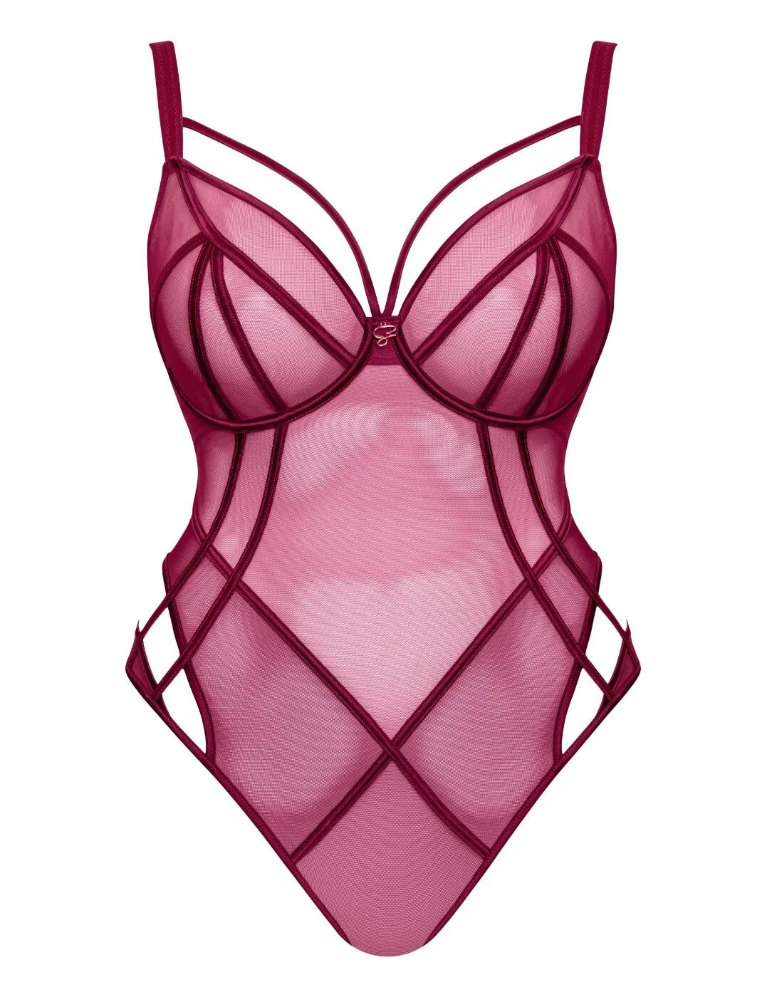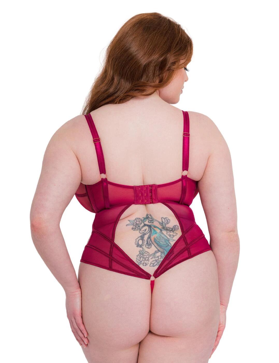 Meet the Sense’s plunge bodysuit from Scantilly by Curvy Kate. Your newest obsession. The entire bodice of the piece is made from sheer stretch mesh, creating an exposing and tantalising style. This style continues through the cut-out back and the cut-out along the hips, further exposing more skin. Strapping detailing over the bust creates a bondage inspired look. This then continues down the torso for a curve enhancing and flattering effect. The cups are underwired to offer you a stunning uplift that is then beautifully framed by the deep plunging neckline. The cups are not padded allowing for a natural, and barely-there, feeling fit. The straps are fully adjustable, and meet at a soft hook and eye closure, meaning your perfect fit is just waiting for you. The rear of the piece is finished with further exposure of your derrière, styled by a thong. The piece has additional rose gold adornments across it for an added heir of glamour.